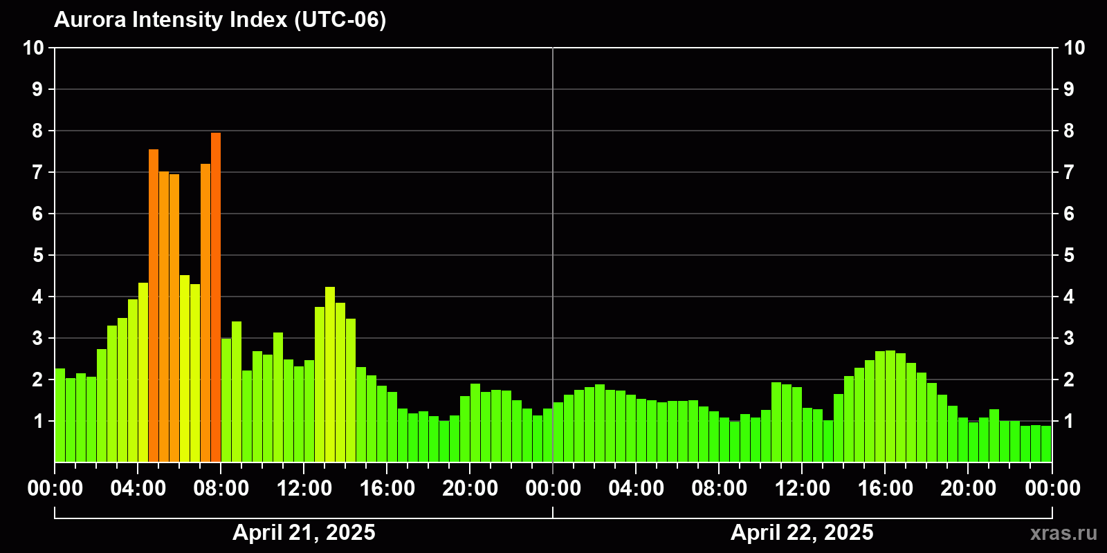 Changes in the auroral intensity index from 2025-04-21 to 2025-04-22 local time