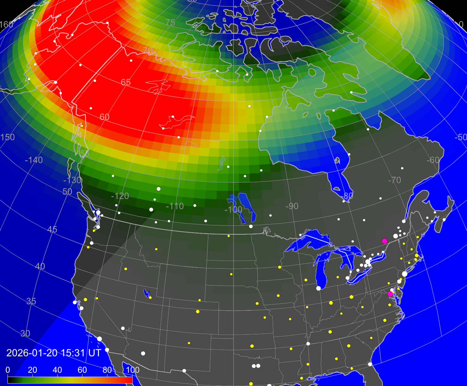 Вероятность полярных сияний в городах США