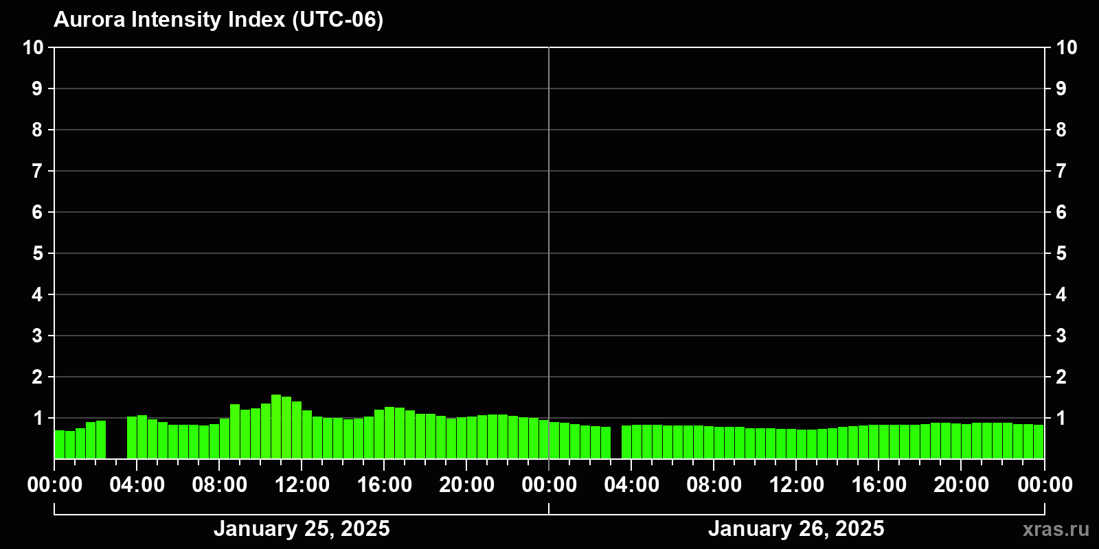 Auroral intensity index and the theoretically possible latitude of observations for nighttime in the Western Hemisphere as of 2025-01-26 23:46 (end of day) local time
