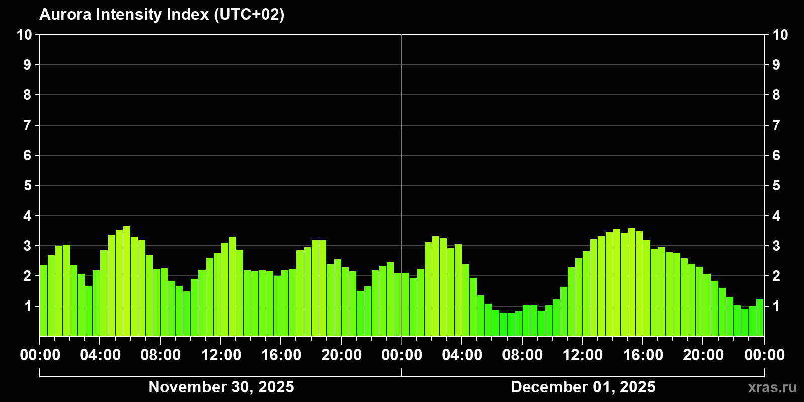 Changes in the auroral intensity index from 2025-11-30 to 2025-12-01 local time