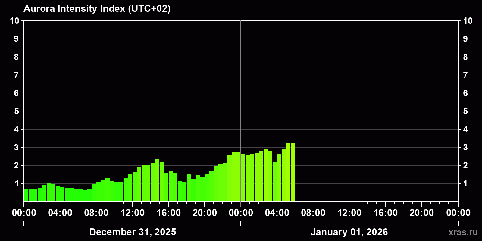 Auroral intensity index and the theoretically possible latitude of observations for nighttime in the Estern Hemisphere as of 2026-01-01 04:09 (end of day) local time
