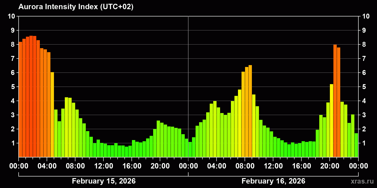 Auroral intensity index and the theoretically possible latitude of observations for nighttime in the Estern Hemisphere as of 2026-02-16 23:46 (end of day) local time