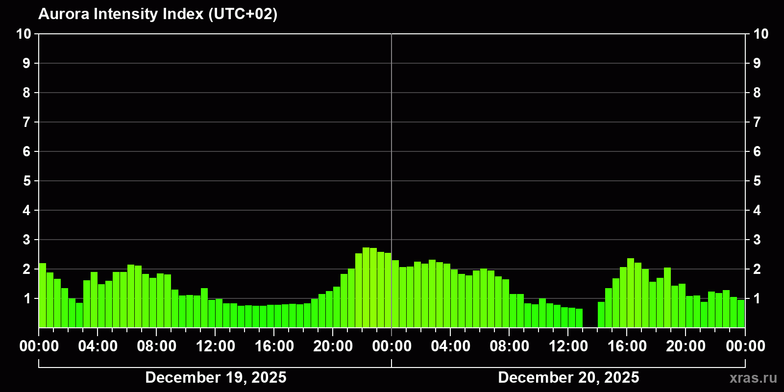 Auroral intensity index and the theoretically possible latitude of observations for nighttime in the Estern Hemisphere as of 2025-12-20 23:57 (end of day) local time