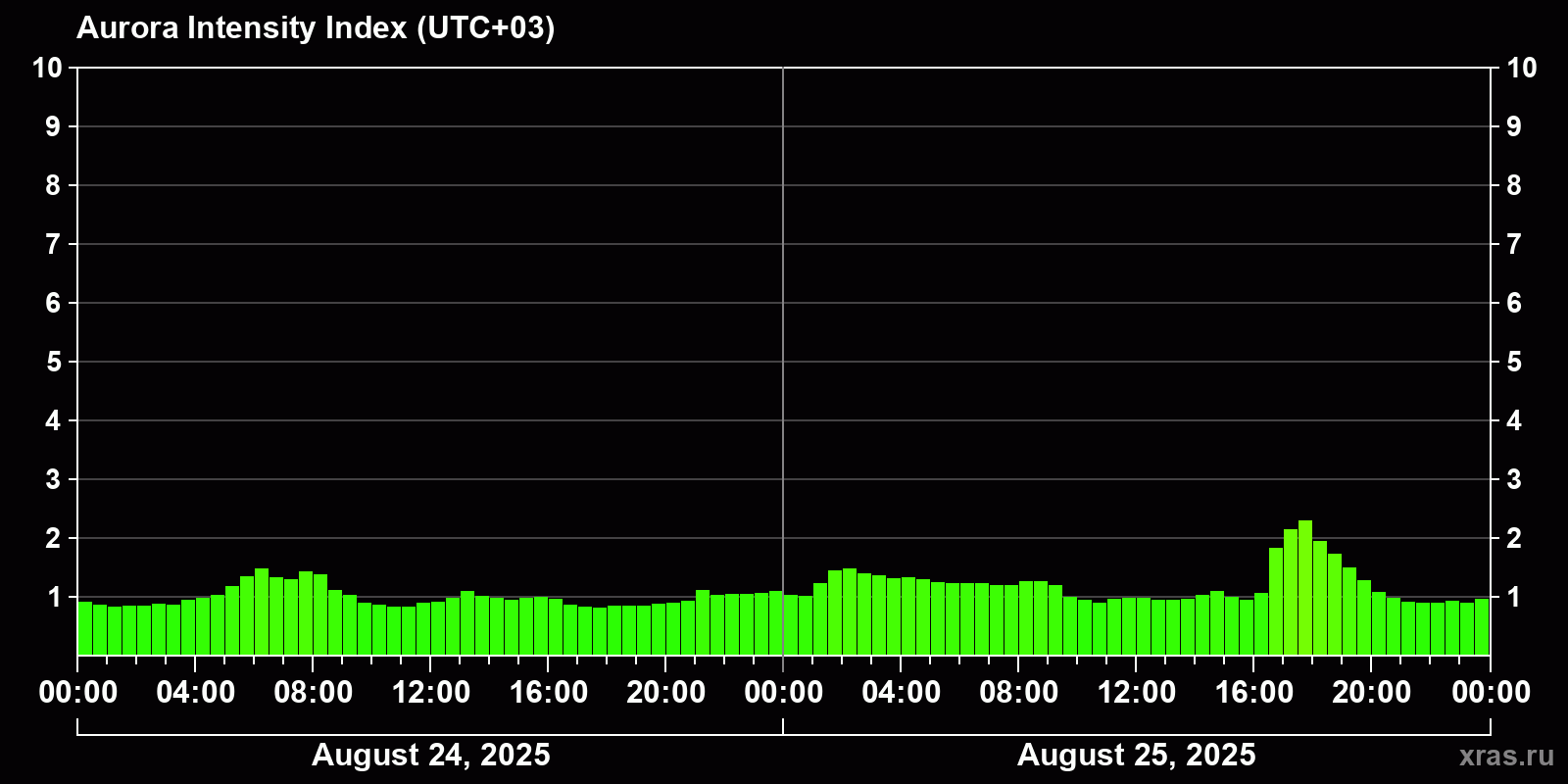 Changes in the auroral intensity index from 2025-08-24 to 2025-08-25 local time