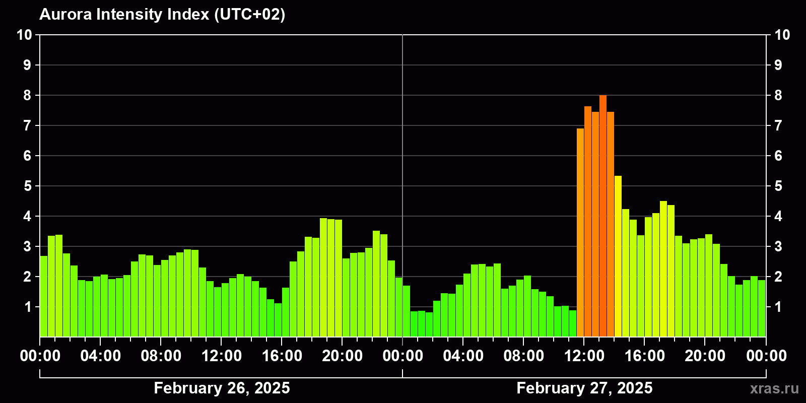 Changes in the auroral intensity index from 2025-02-26 to 2025-02-27 local time