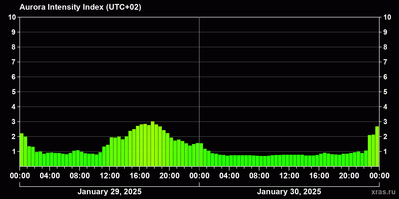 Auroral intensity index and the theoretically possible latitude of observations for nighttime in the Estern Hemisphere as of 2025-01-30 23:53 (end of day) local time