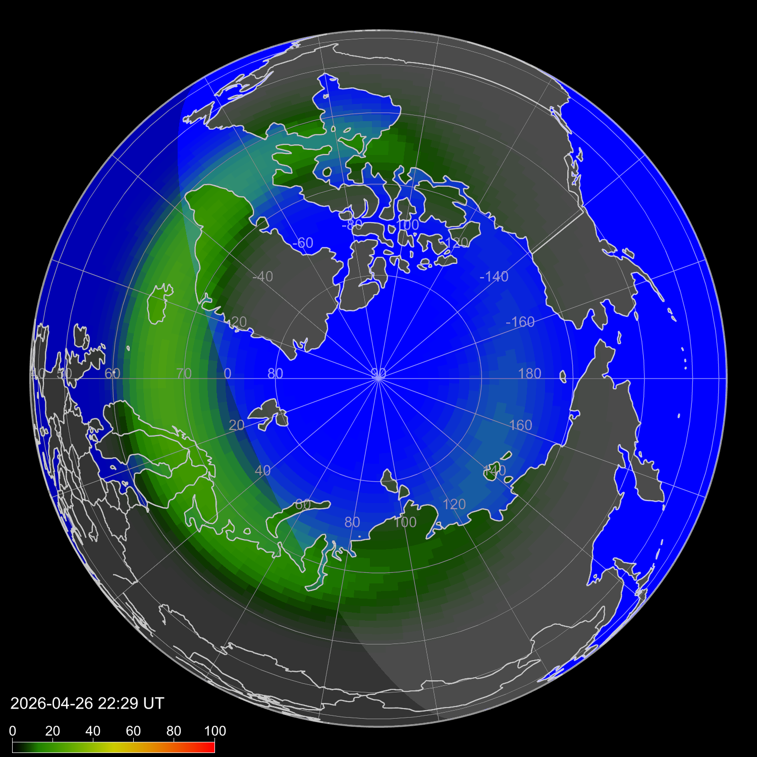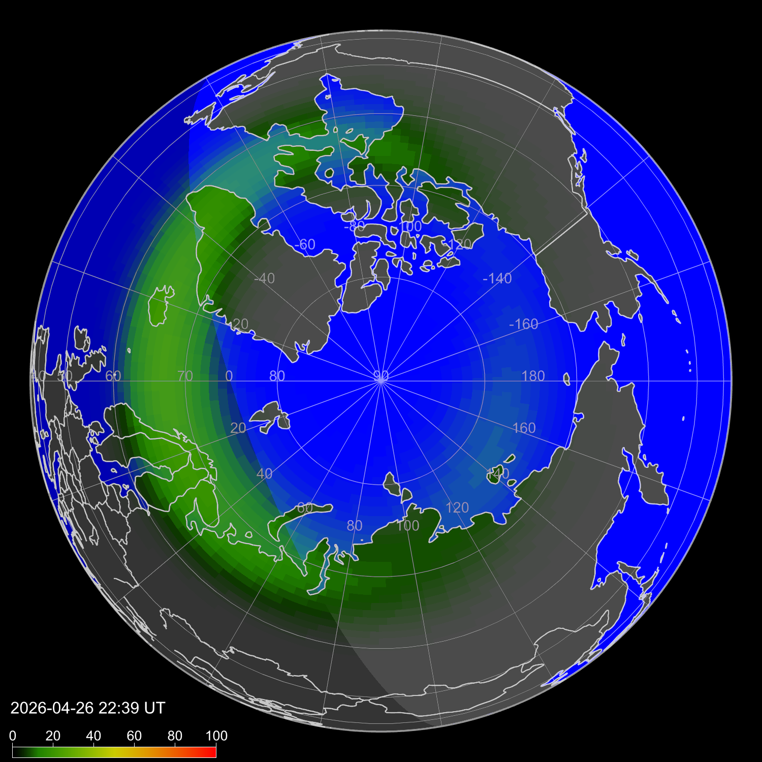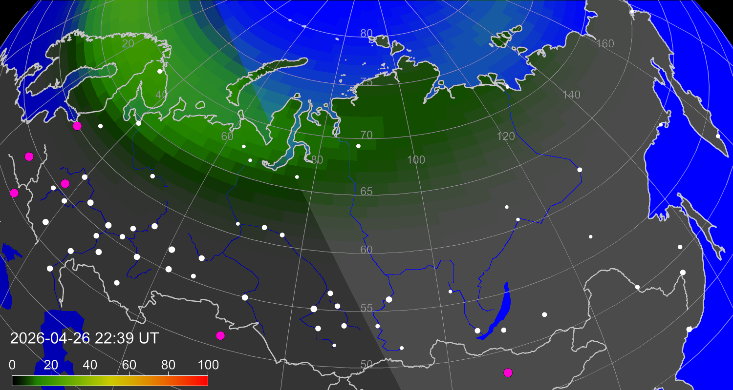 Changes and hourly forecast of the auroral intensity index from 2026-04-26 to 2026-04-27