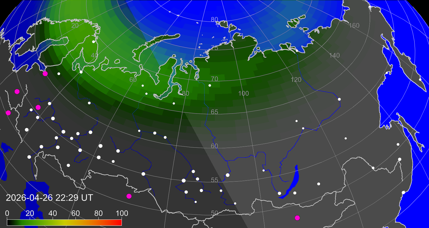 Auroral intensity index and theoretically possible latitude of observations for nighttime in the Estern Hemisphere