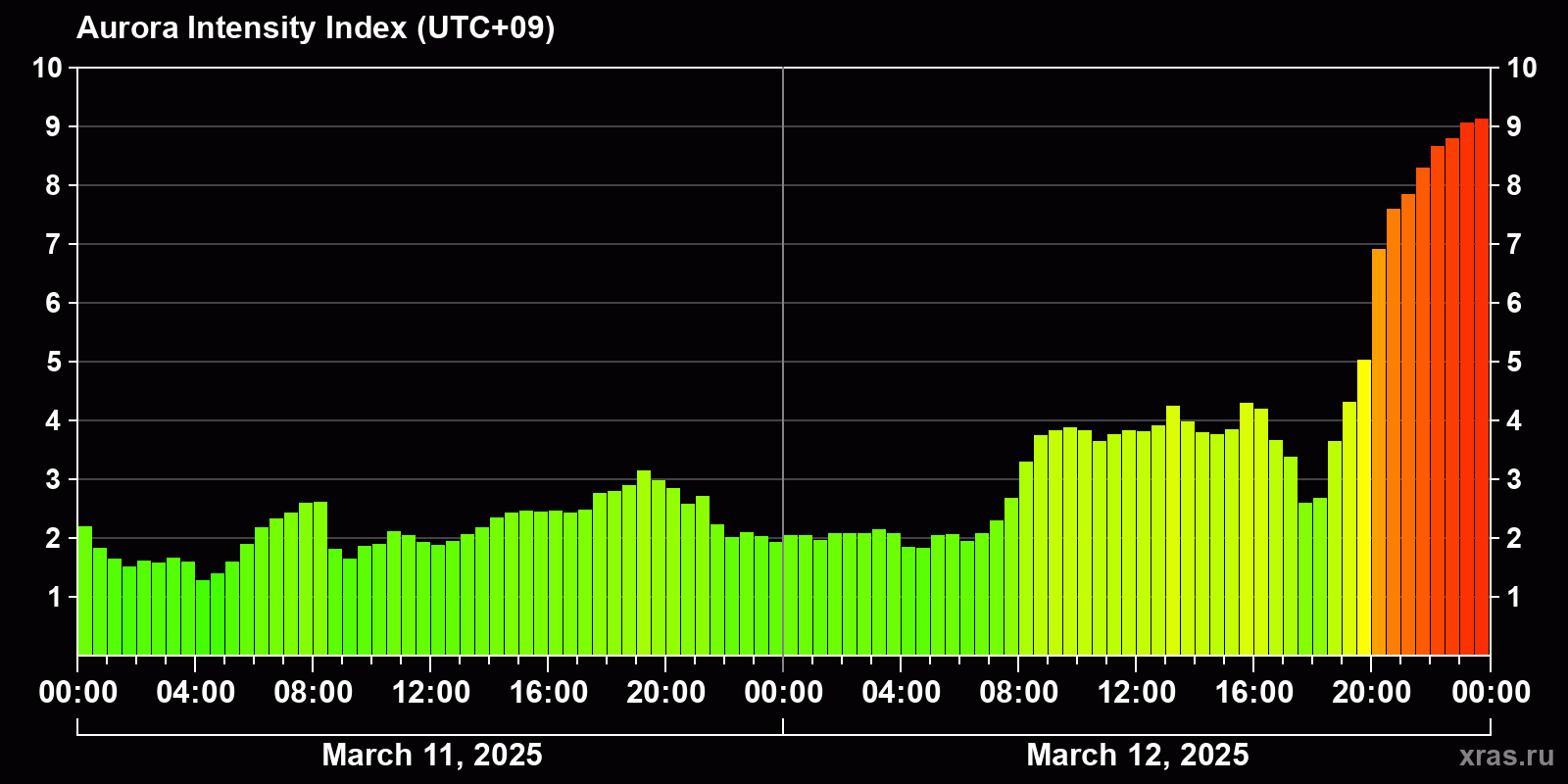 Changes in the auroral intensity index from 2025-03-11 to 2025-03-12 local time