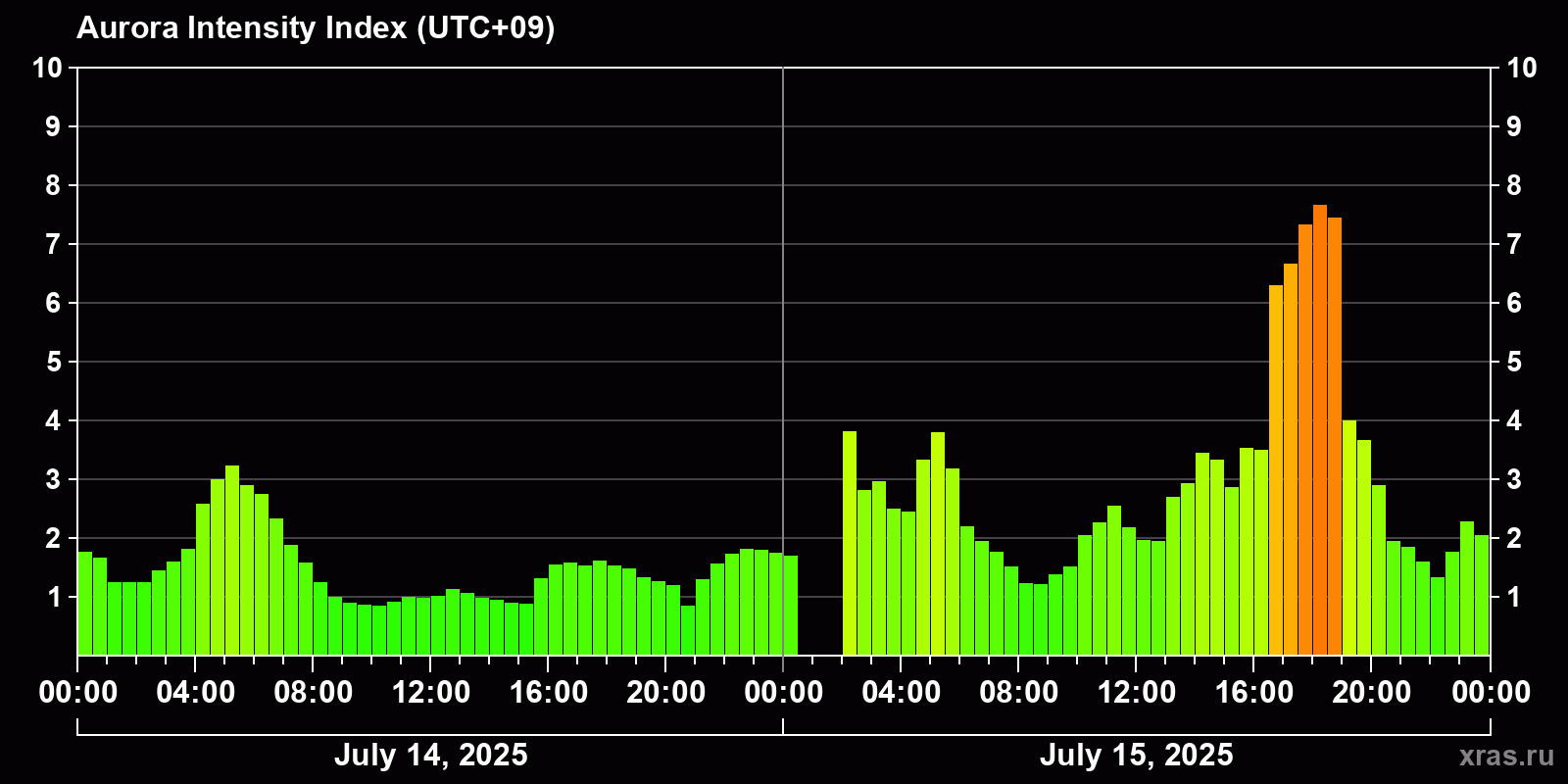 Changes in the auroral intensity index from 2025-07-14 to 2025-07-15 local time