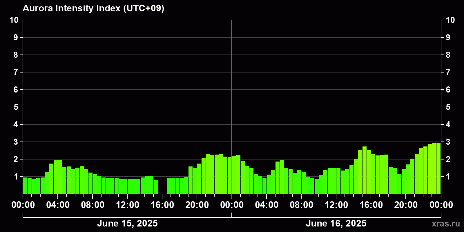 Changes in the auroral intensity index from 2025-06-15 to 2025-06-16 local time