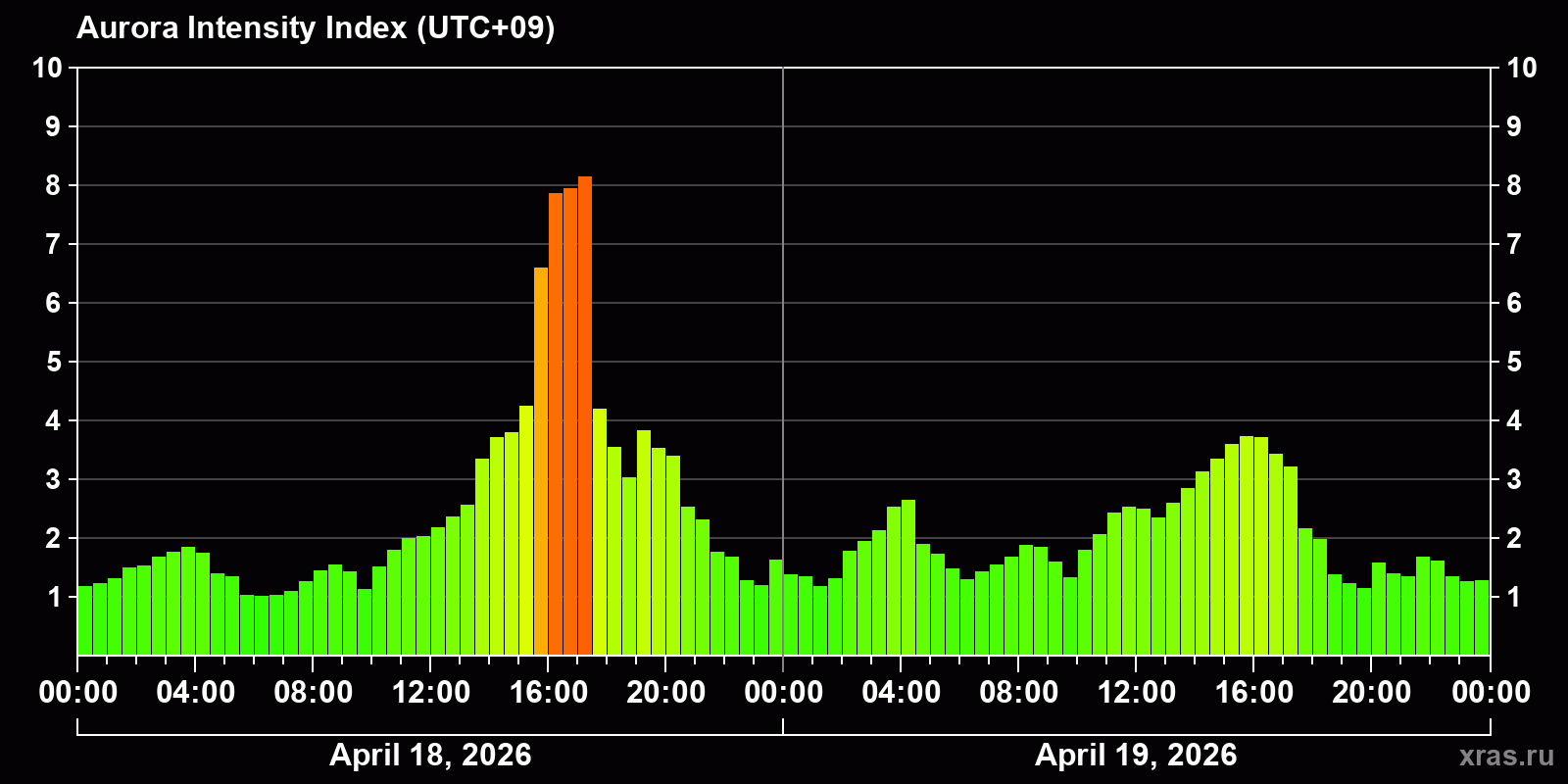 Changes in the auroral intensity index from 2026-04-18 to 2026-04-19 local time