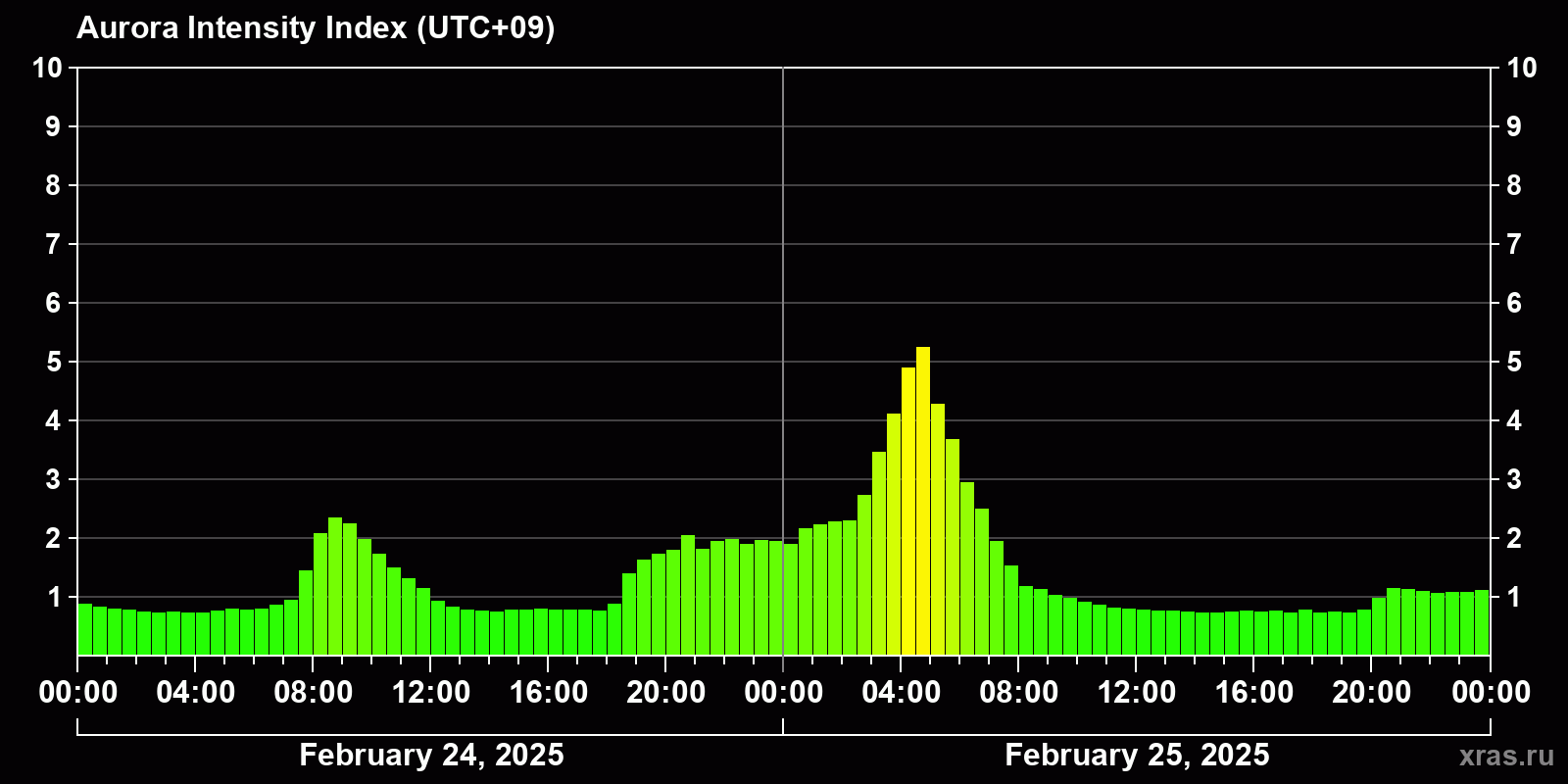 Changes in the auroral intensity index from 2025-02-24 to 2025-02-25 local time