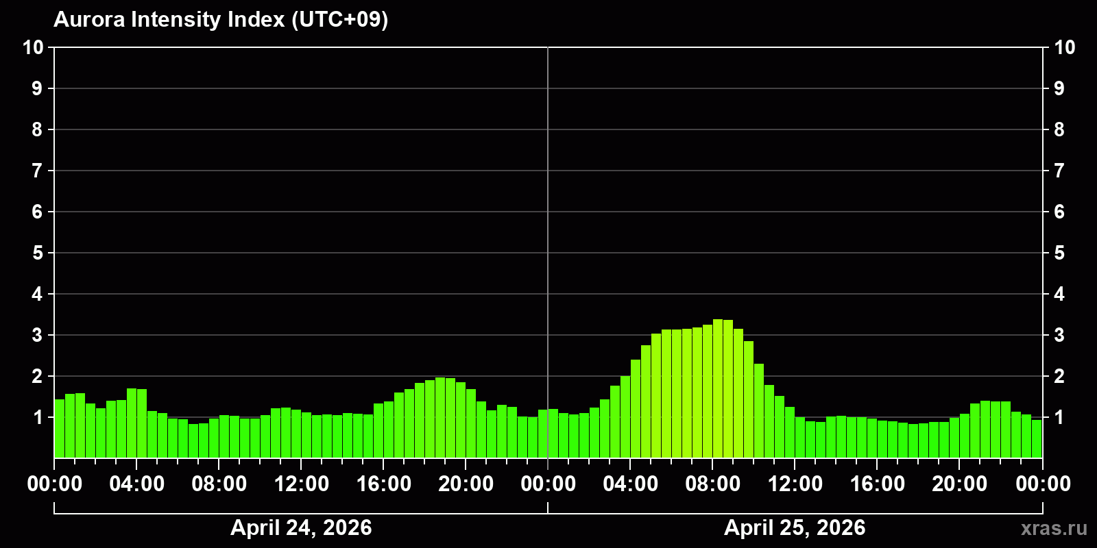 Changes in the auroral intensity index from 2026-04-24 to 2026-04-25 local time