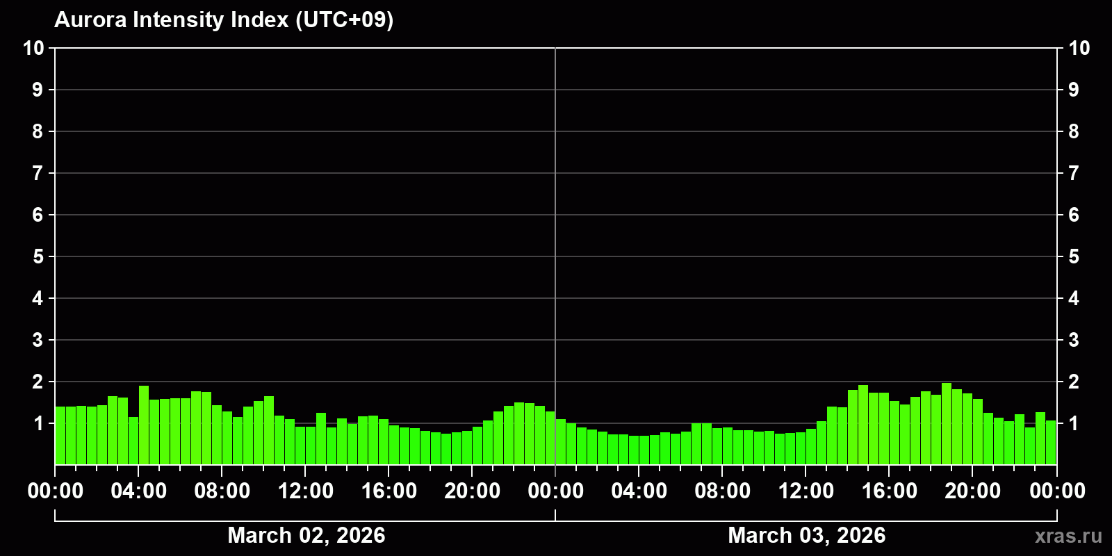 Changes in the auroral intensity index from 2026-03-02 to 2026-03-03 local time