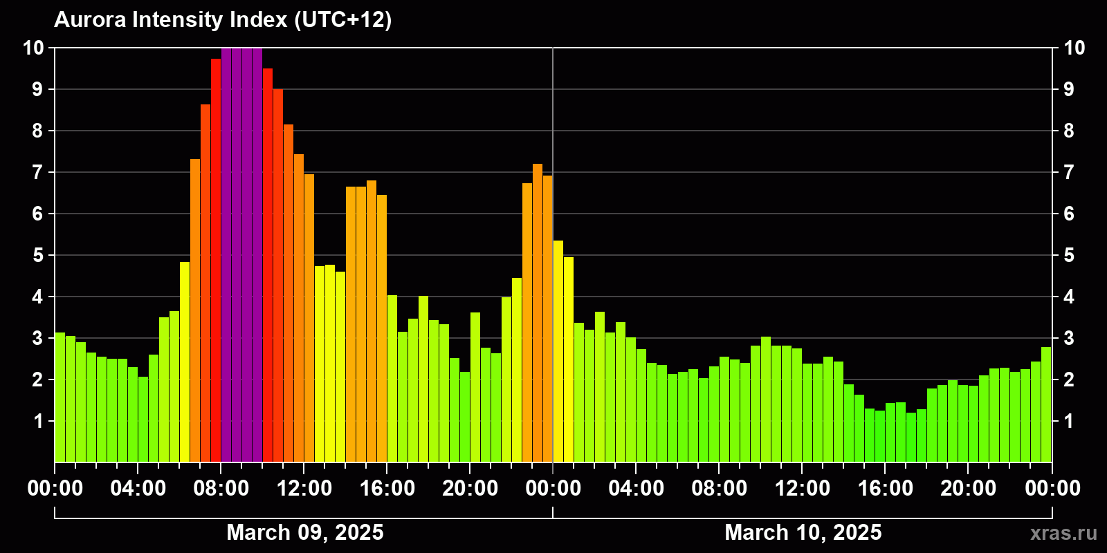 Changes in the auroral intensity index from 2025-03-09 to 2025-03-10 local time
