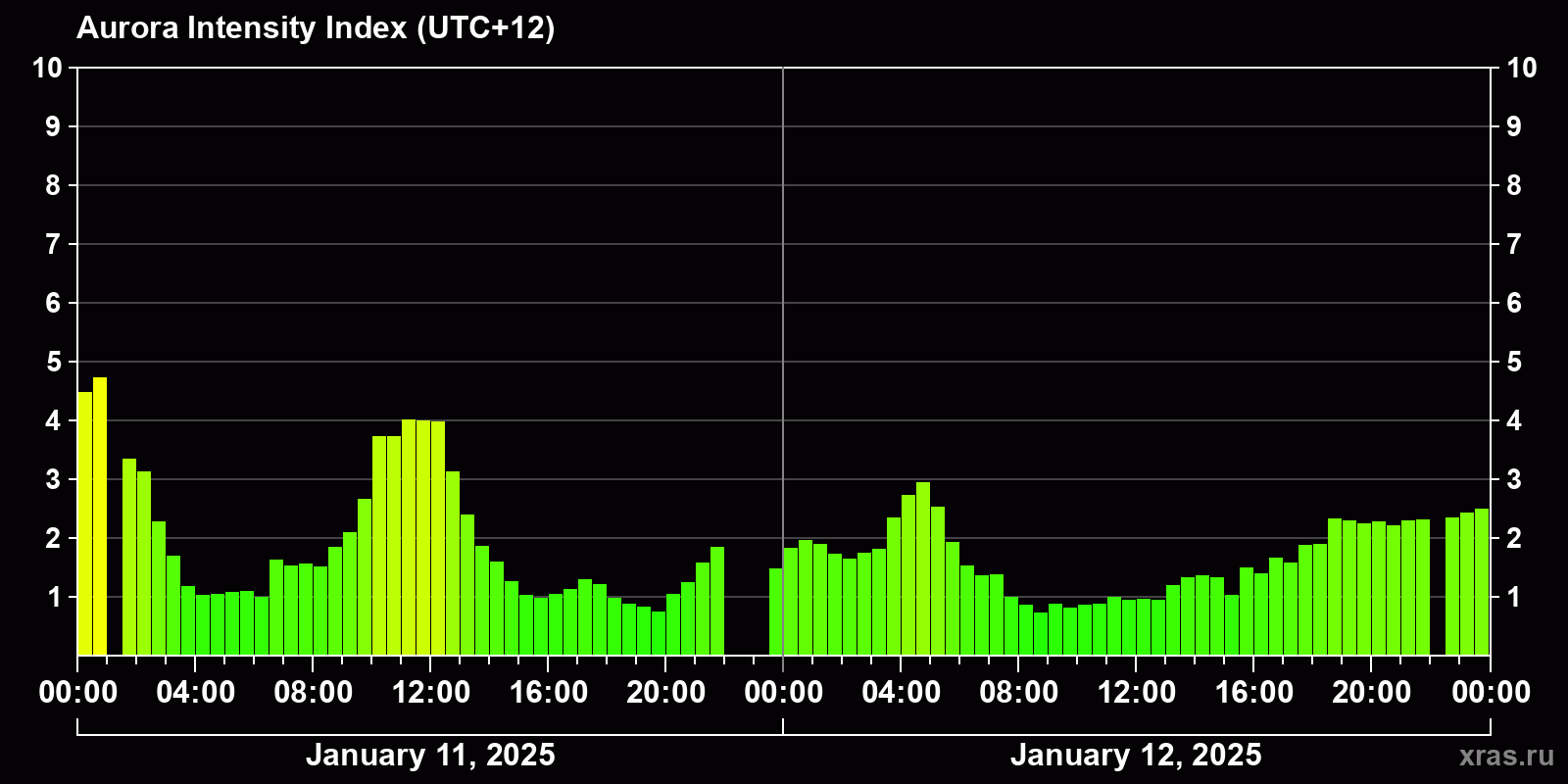 Changes in the auroral intensity index from 2025-01-11 to 2025-01-12 local time