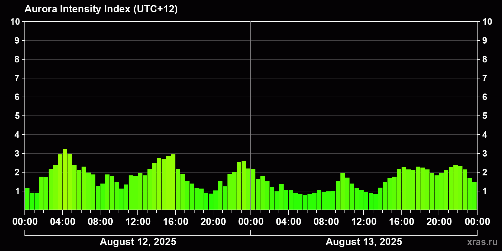 Changes in the auroral intensity index from 2025-08-13 to 2025-08-14 local time