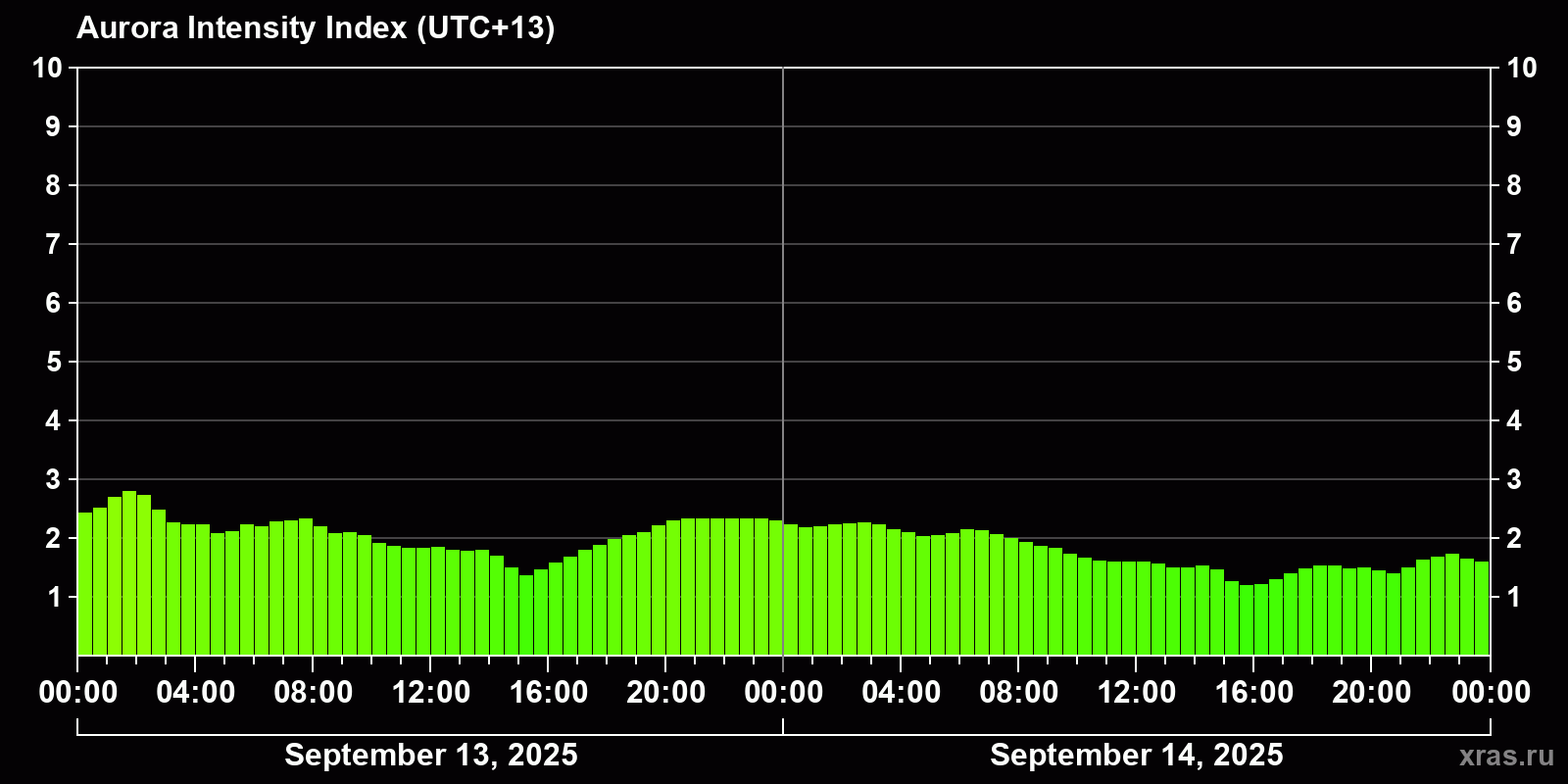 Changes in the auroral intensity index from 2025-09-13 to 2025-09-14 local time