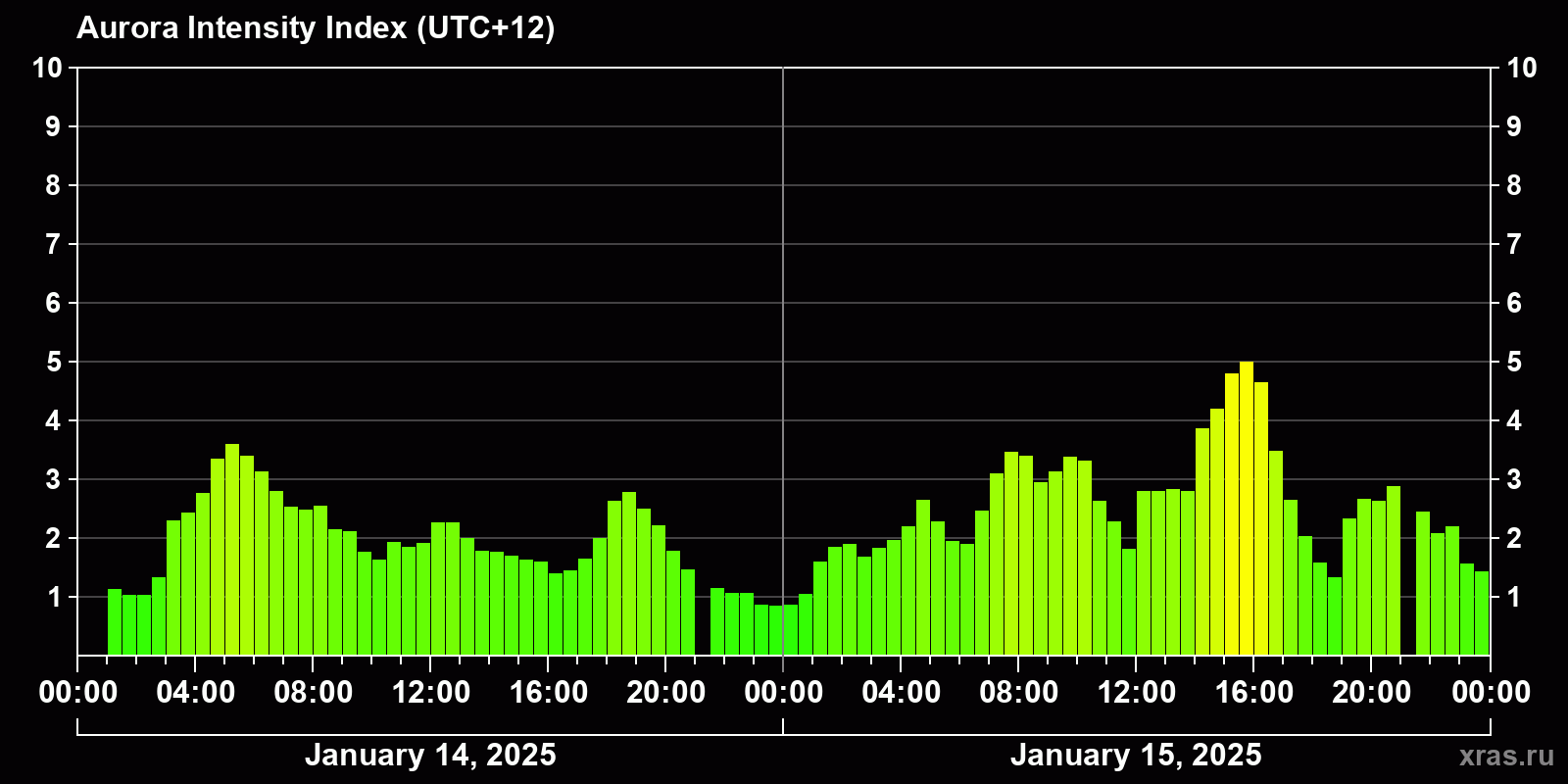 Changes in the auroral intensity index from 2025-01-14 to 2025-01-15 local time