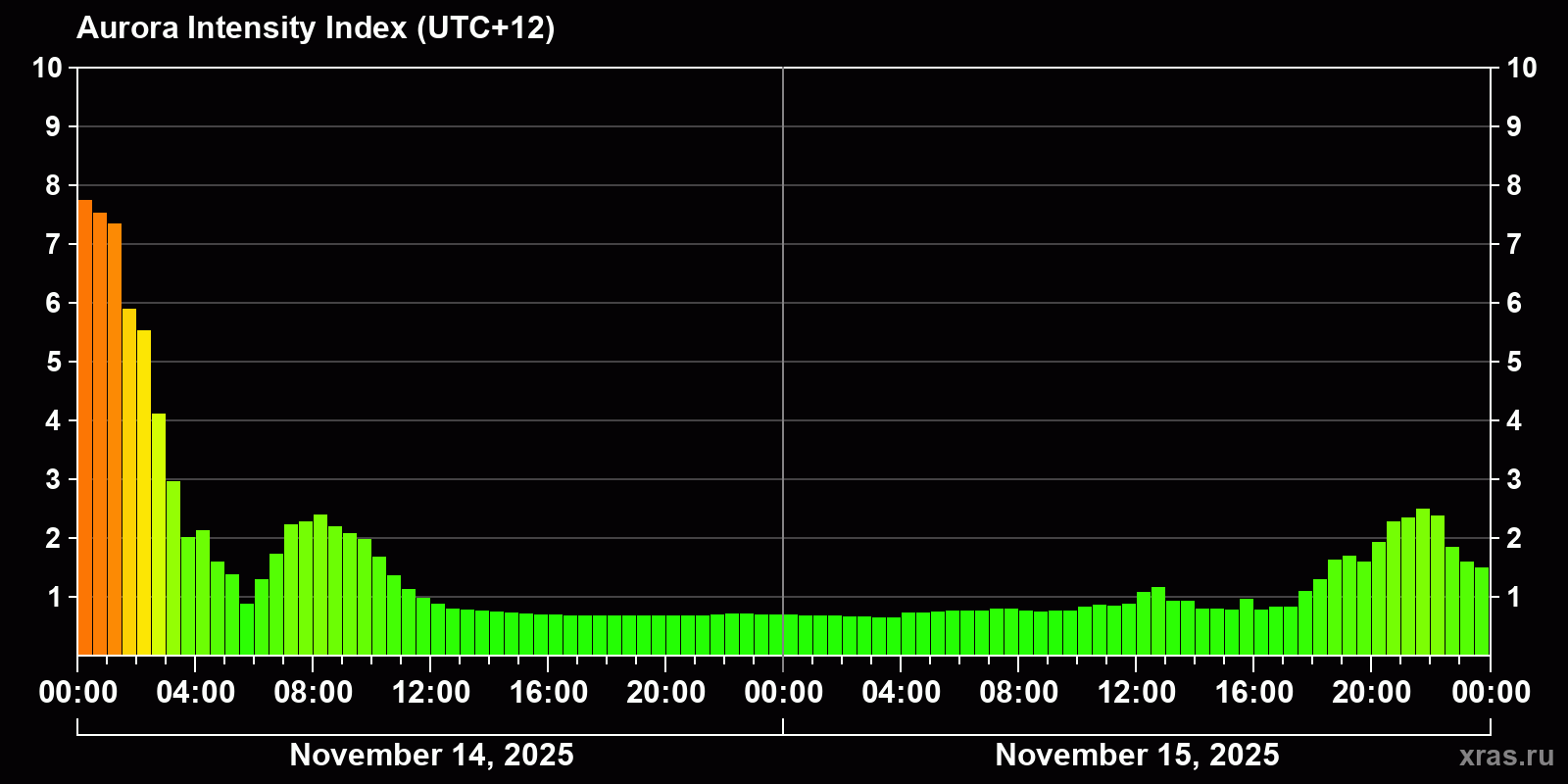 Changes in the auroral intensity index from 2025-11-14 to 2025-11-15 local time