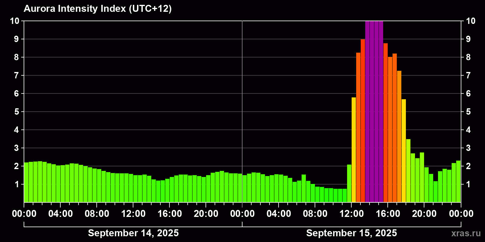 Changes in the auroral intensity index from 2025-09-15 to 2025-09-16 local time