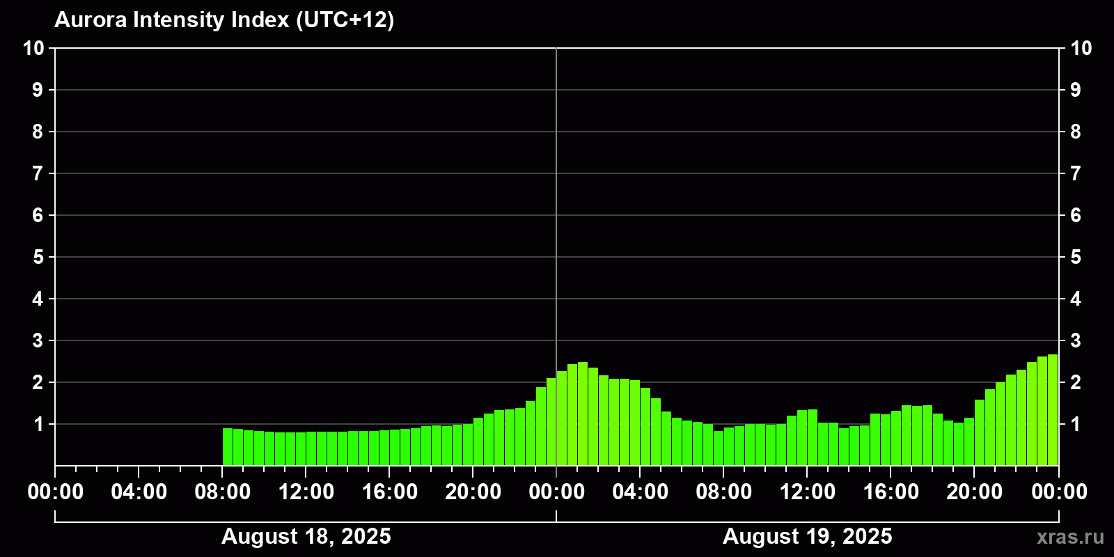 Auroral intensity index and the theoretically possible latitude of observations for nighttime in the Western Hemisphere as of 2025-08-20 00:58 (end of day) local time