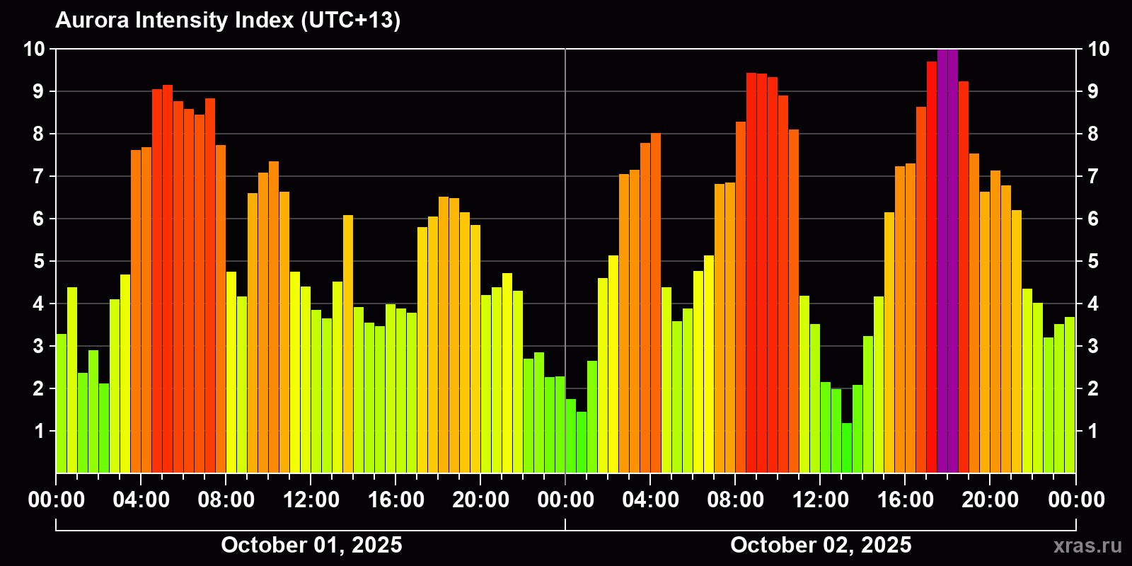 Changes in the auroral intensity index from 2025-10-01 to 2025-10-02 local time