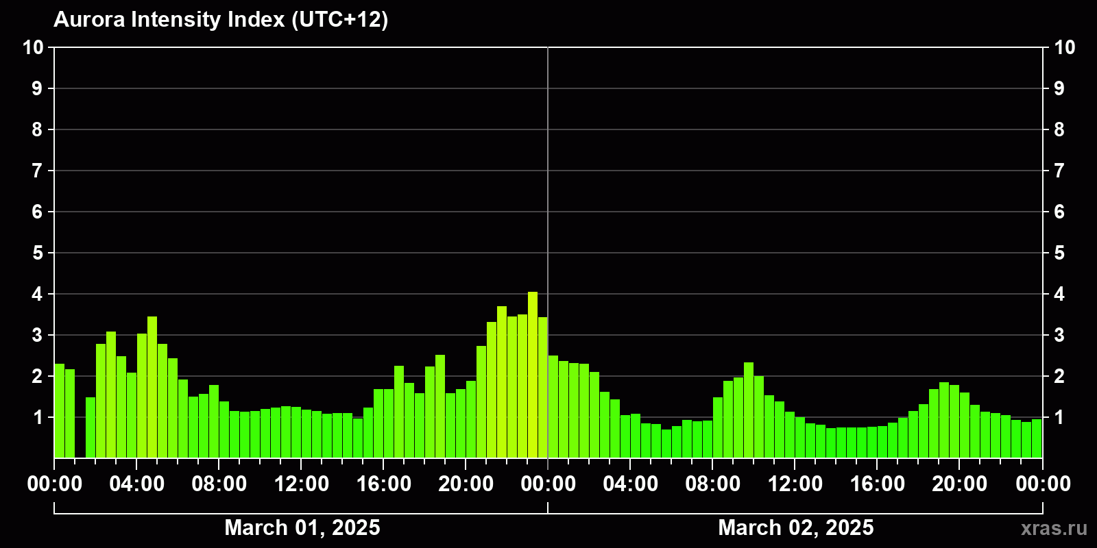 Changes in the auroral intensity index from 2025-03-01 to 2025-03-02 local time
