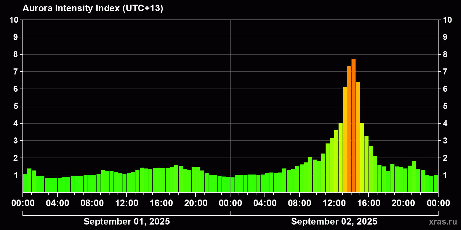 Changes in the auroral intensity index from 2025-09-01 to 2025-09-02 local time