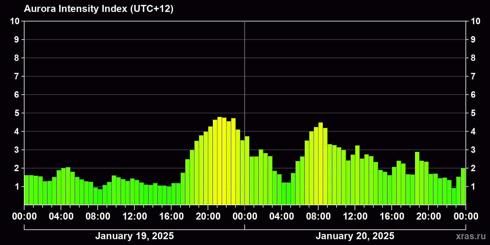 Changes in the auroral intensity index from 2025-01-19 to 2025-01-20 local time