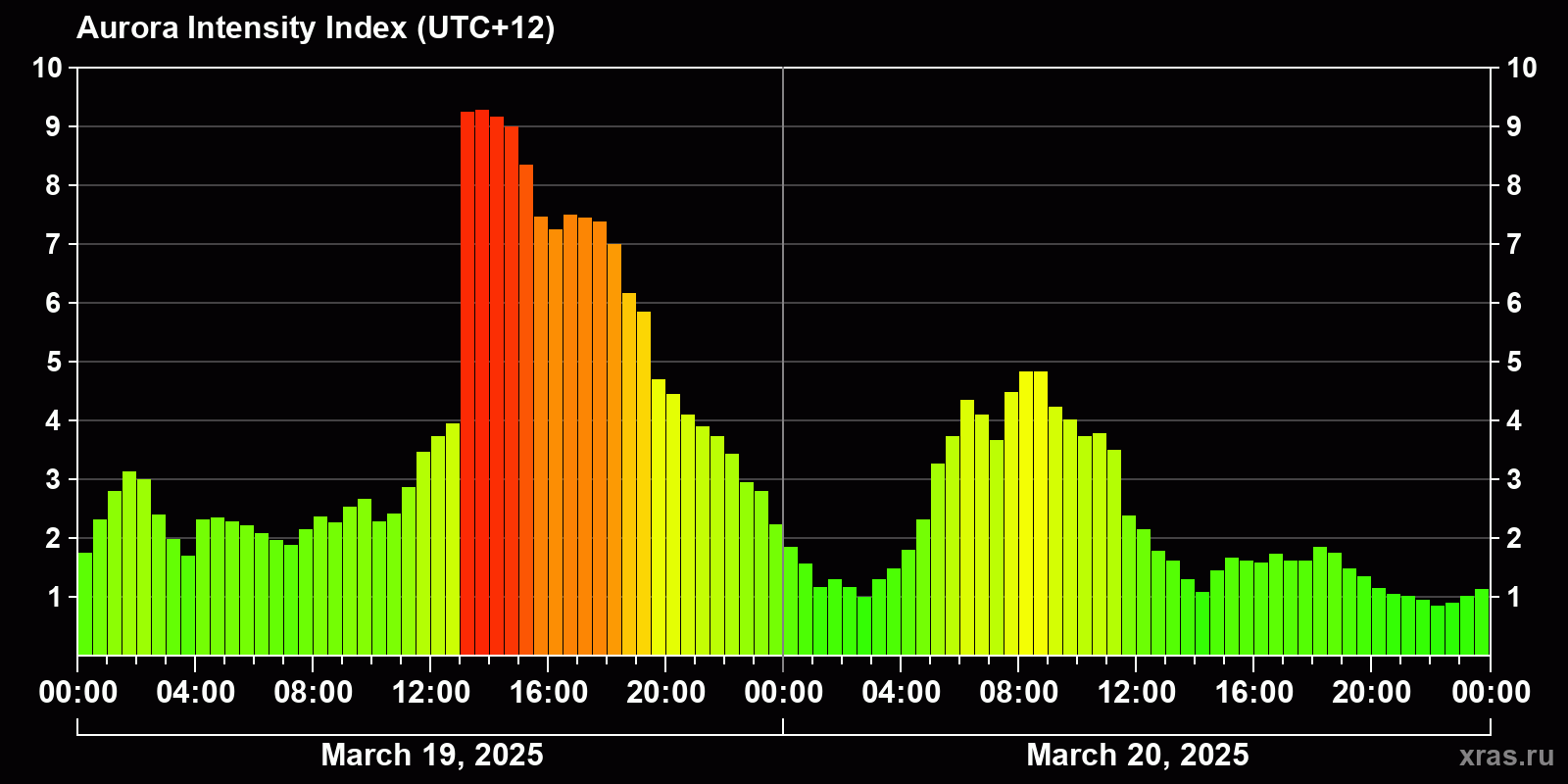 Changes in the auroral intensity index from 2025-03-19 to 2025-03-20 local time