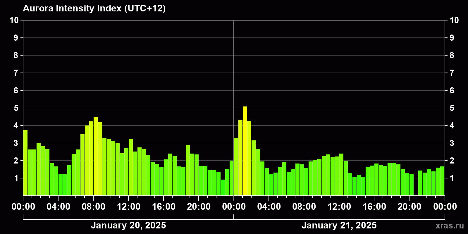 Changes in the auroral intensity index from 2025-01-20 to 2025-01-21 local time