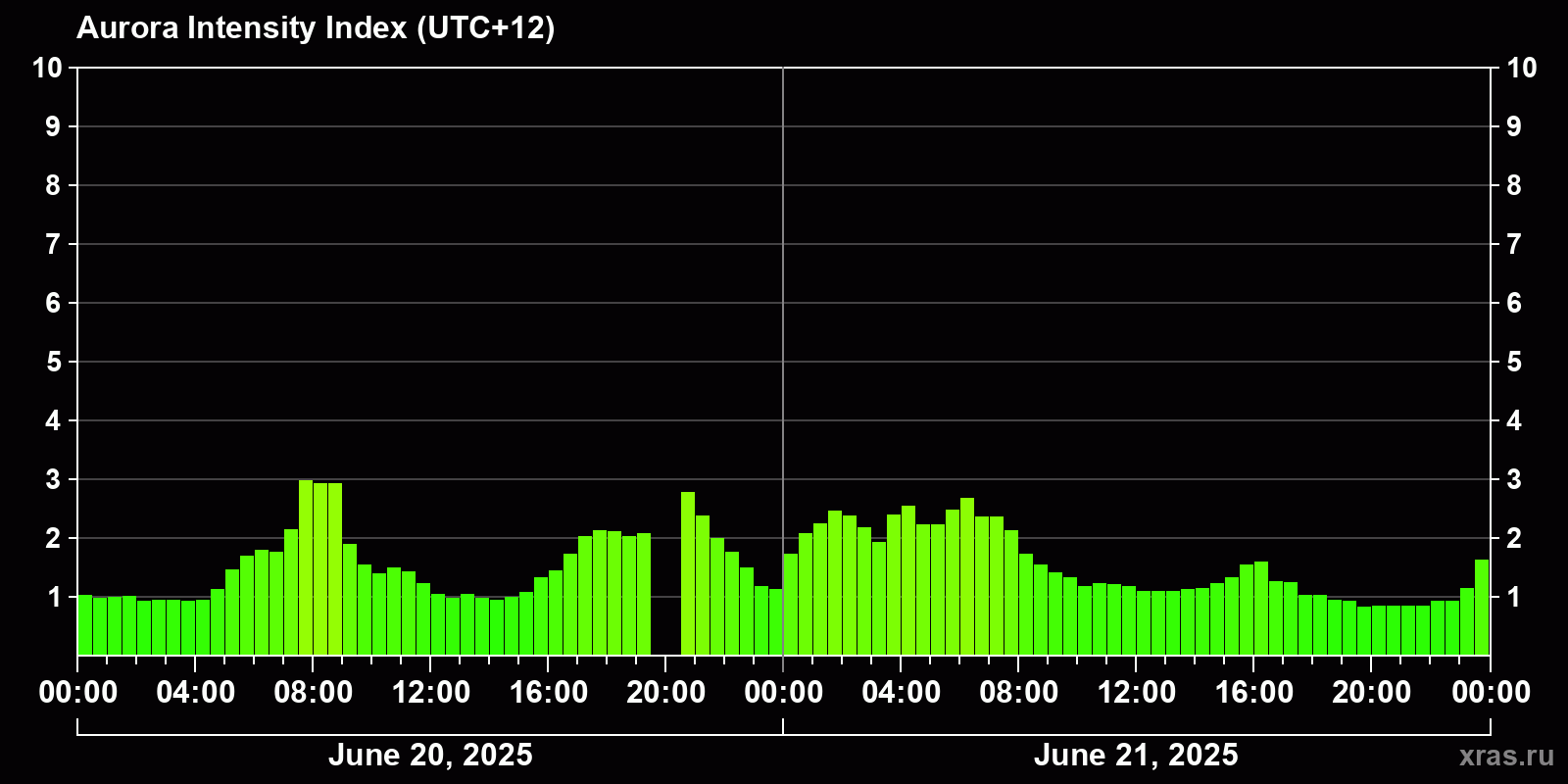 Changes in the auroral intensity index from 2025-06-20 to 2025-06-21 local time