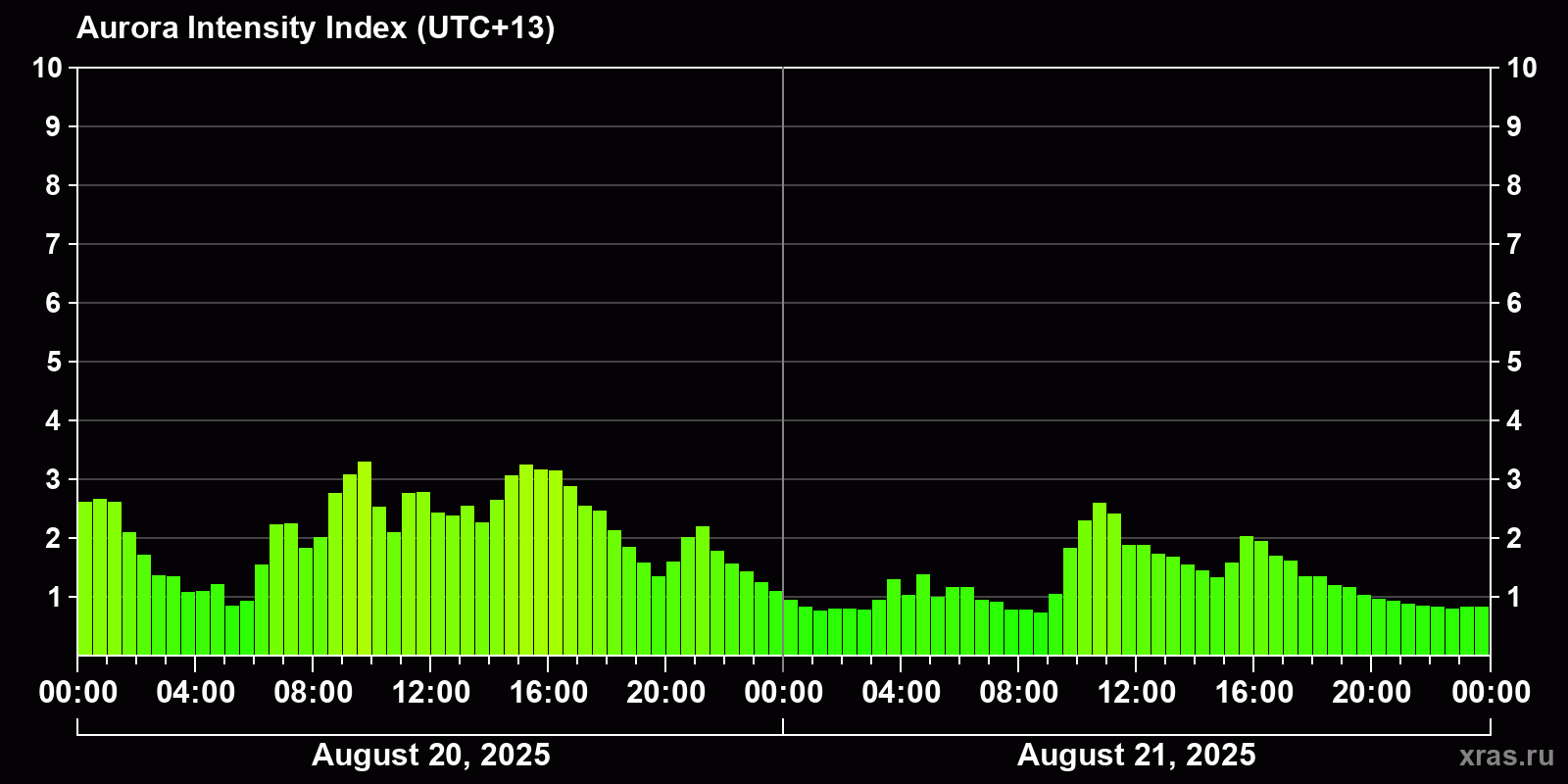 Changes in the auroral intensity index from 2025-08-20 to 2025-08-21 local time