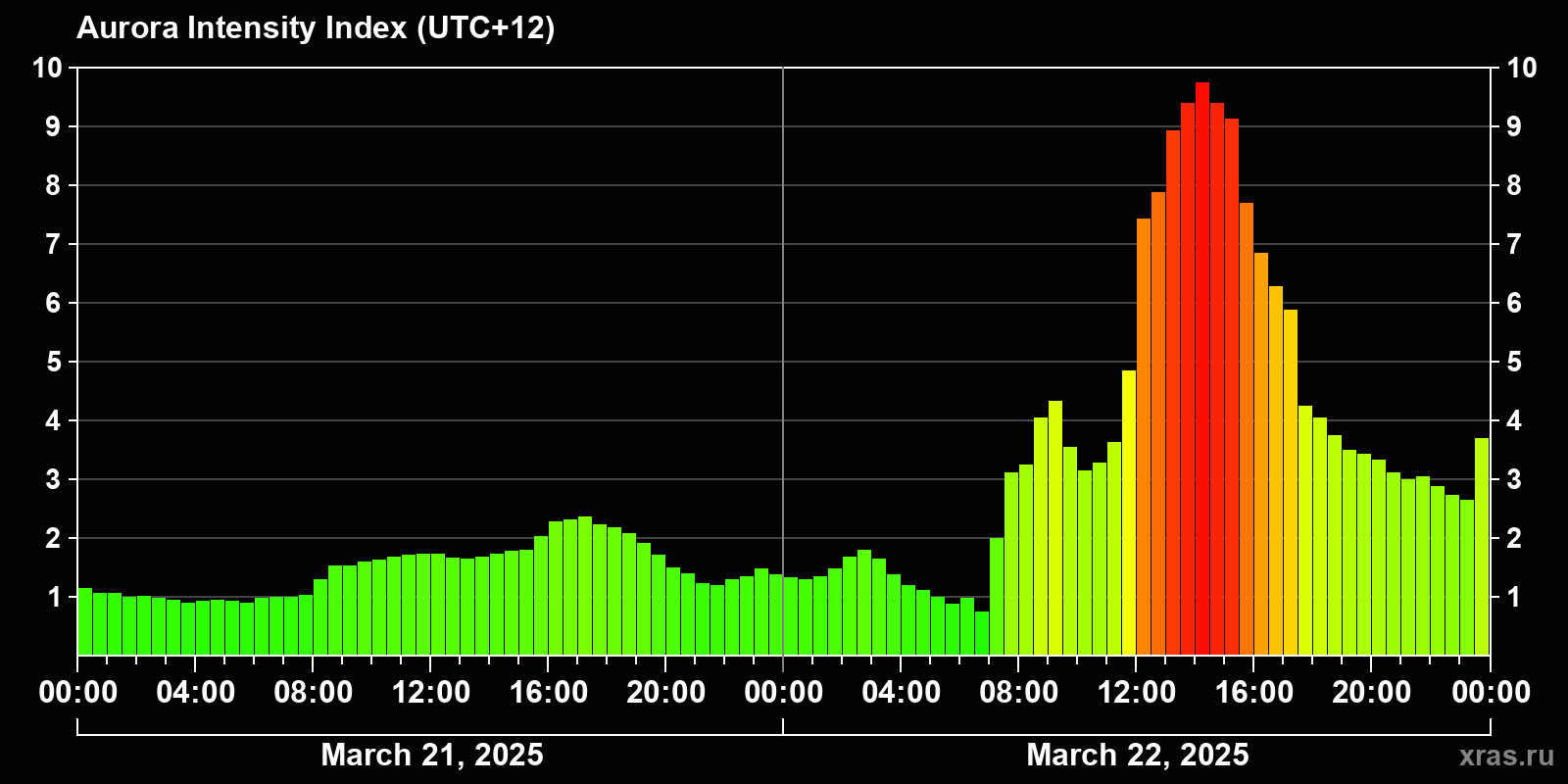 Changes in the auroral intensity index from 2025-03-21 to 2025-03-22 local time