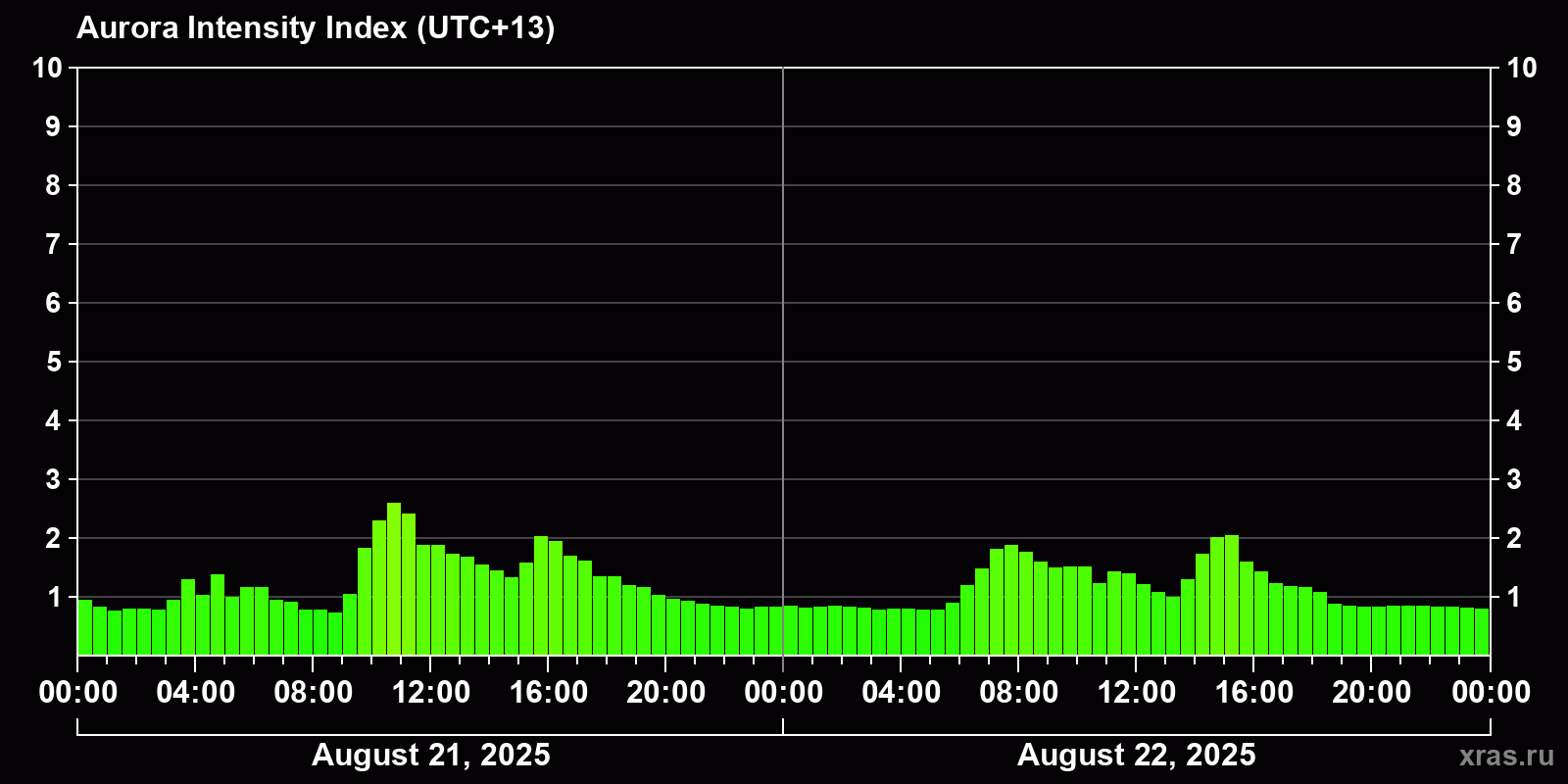 Changes in the auroral intensity index from 2025-08-21 to 2025-08-22 local time
