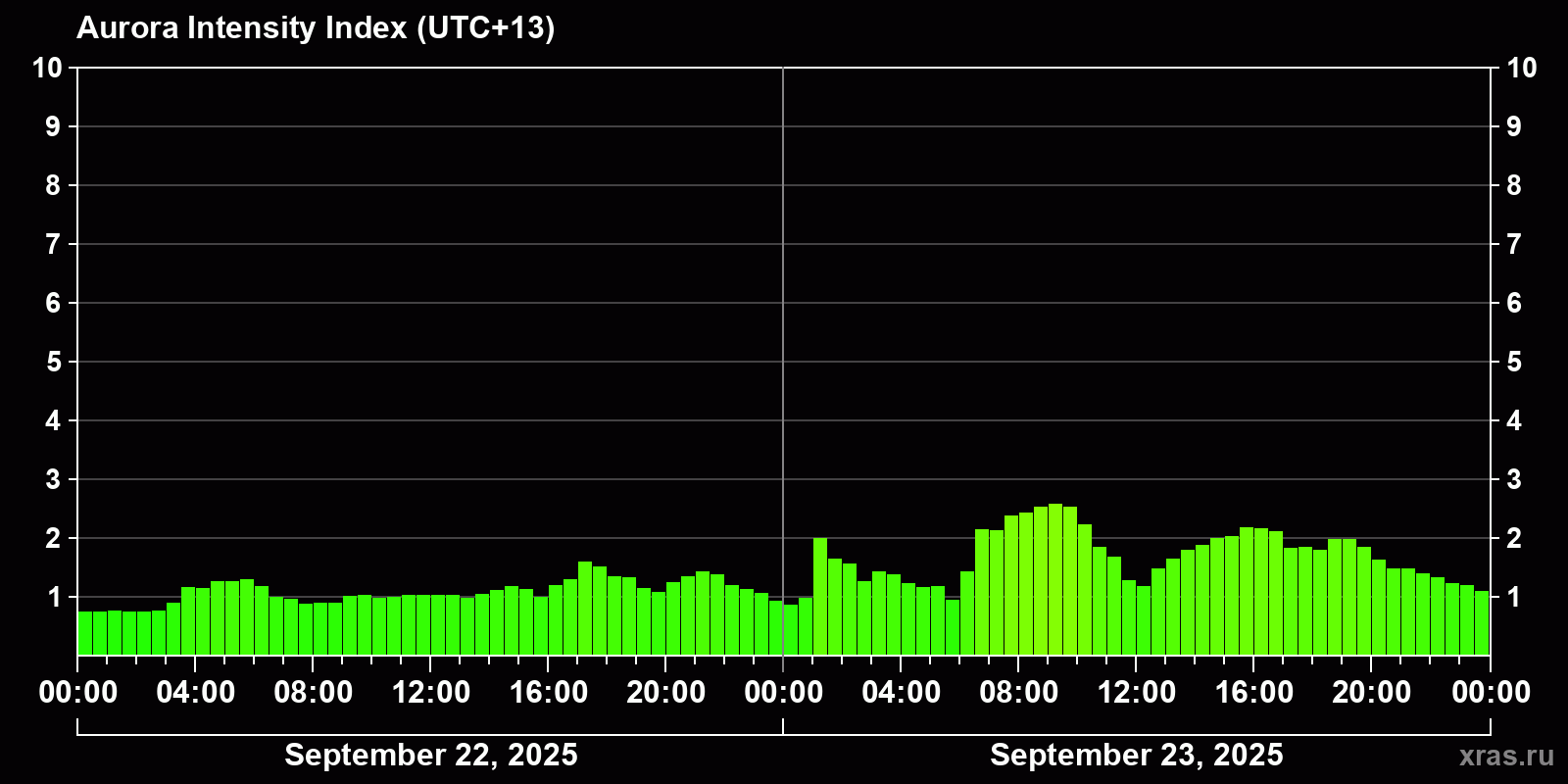 Changes in the auroral intensity index from 2025-09-22 to 2025-09-23 local time