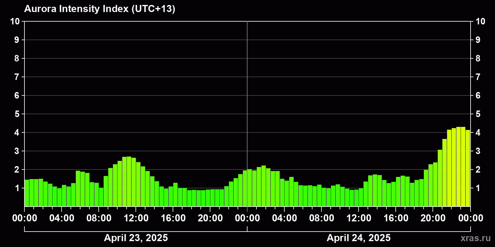 Changes in the auroral intensity index from 2025-04-23 to 2025-04-24 local time