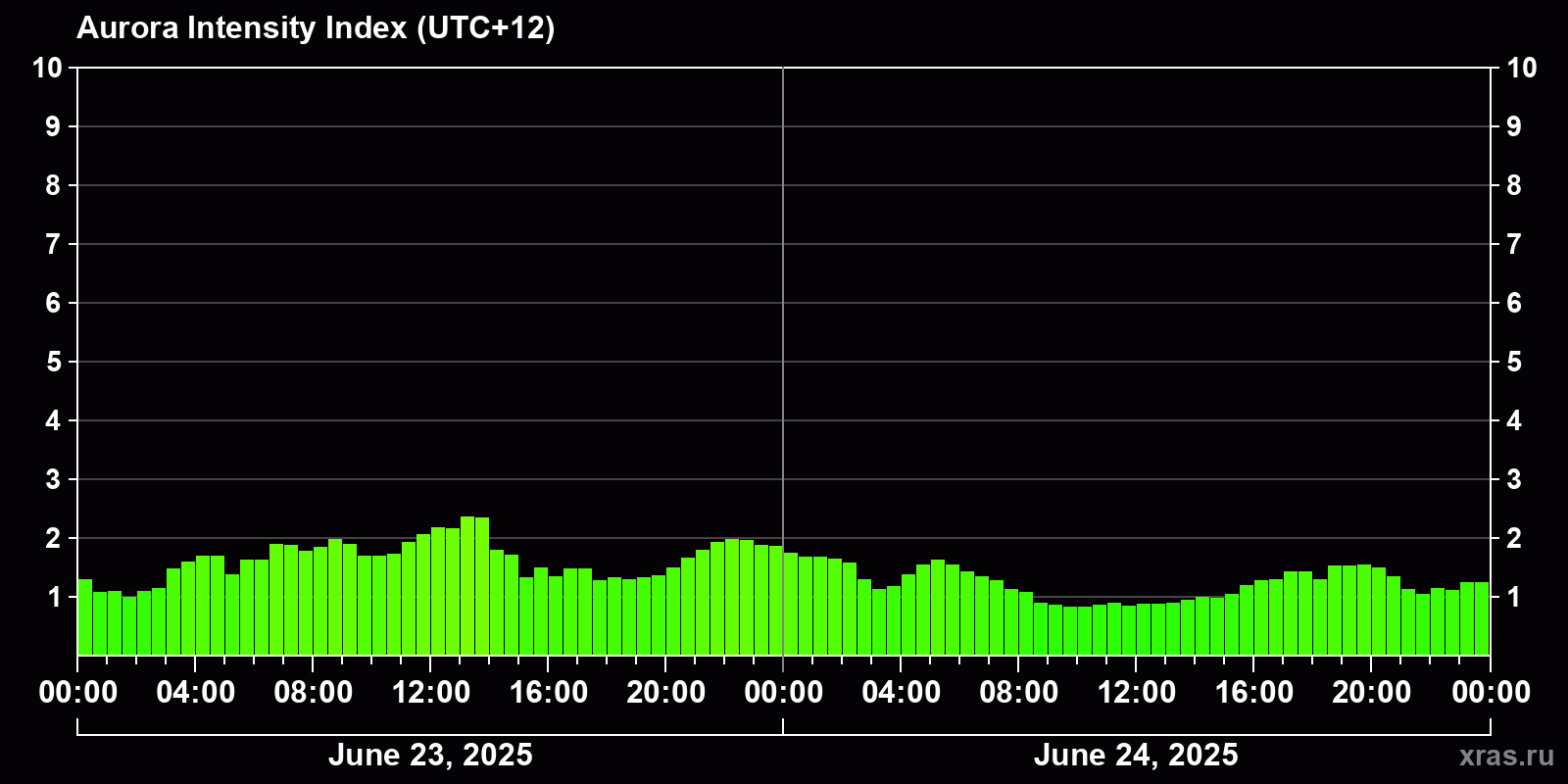 Changes in the auroral intensity index from 2025-06-24 to 2025-06-25 local time