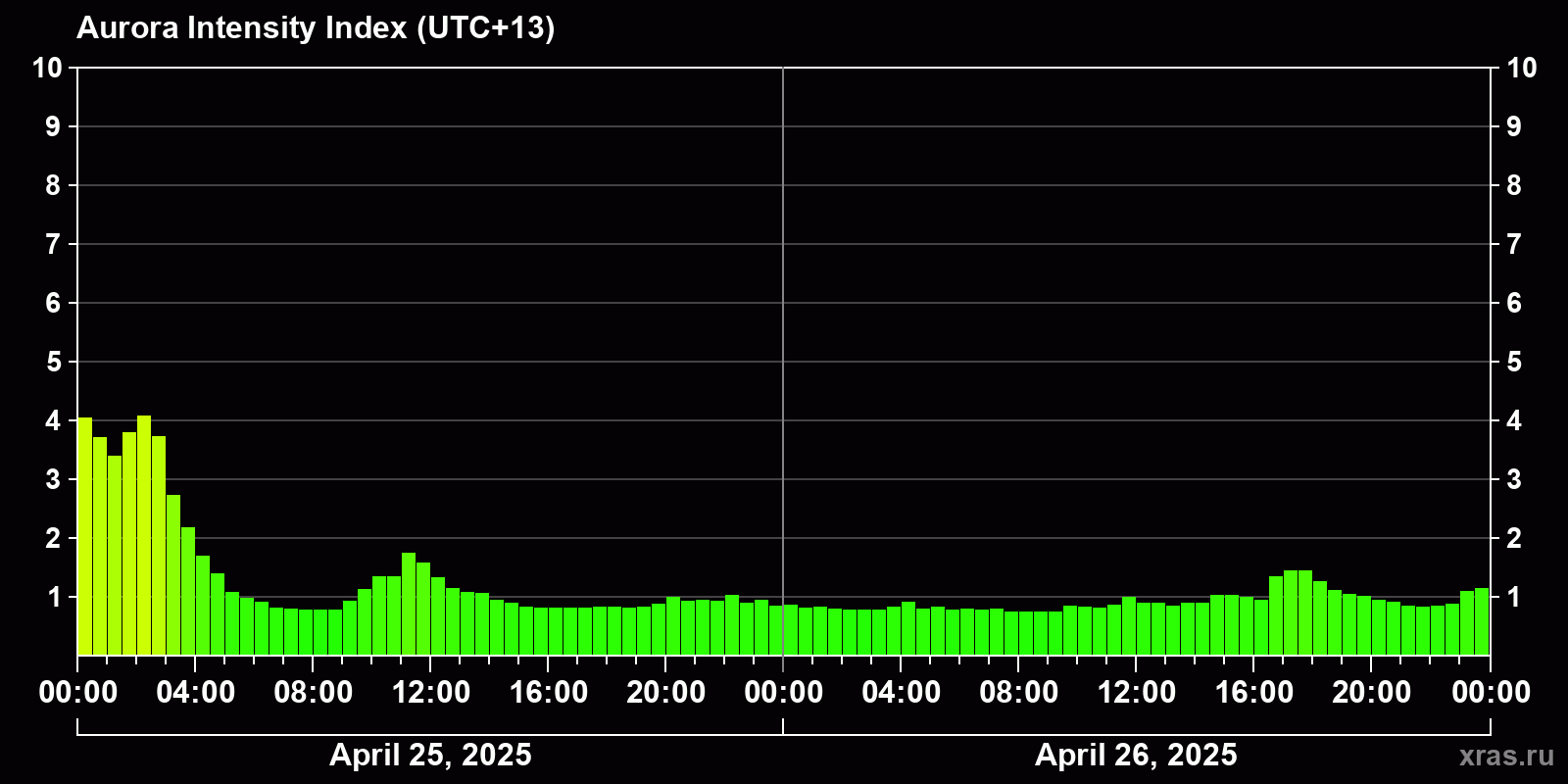Changes in the auroral intensity index from 2025-04-25 to 2025-04-26 local time