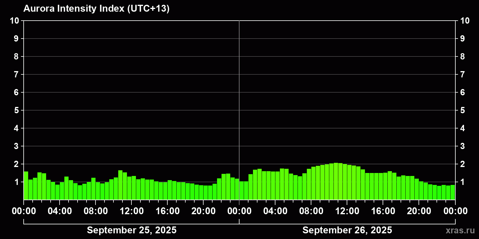 Changes in the auroral intensity index from 2025-09-25 to 2025-09-26 local time
