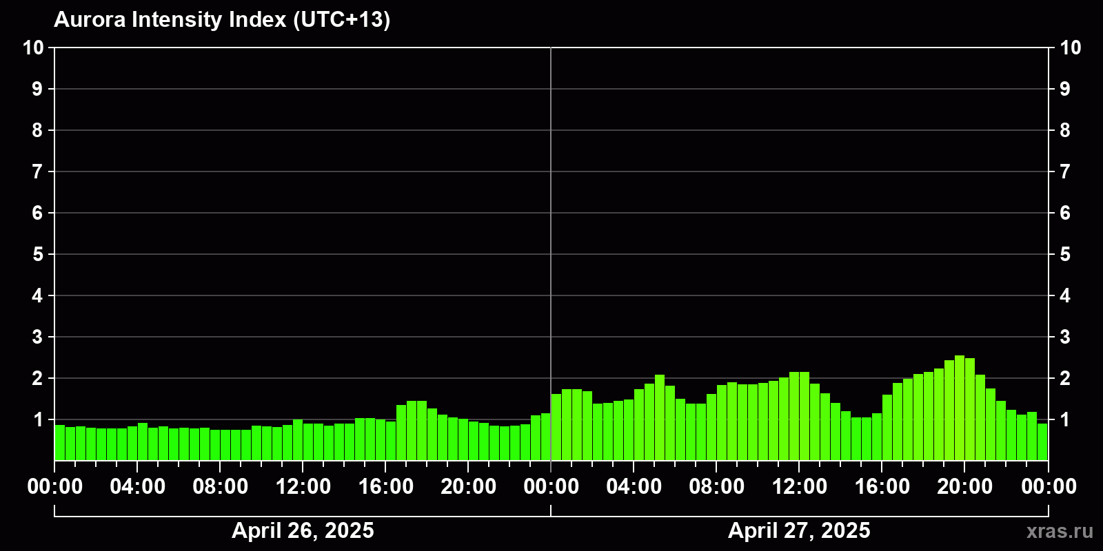 Changes in the auroral intensity index from 2025-04-26 to 2025-04-27 local time