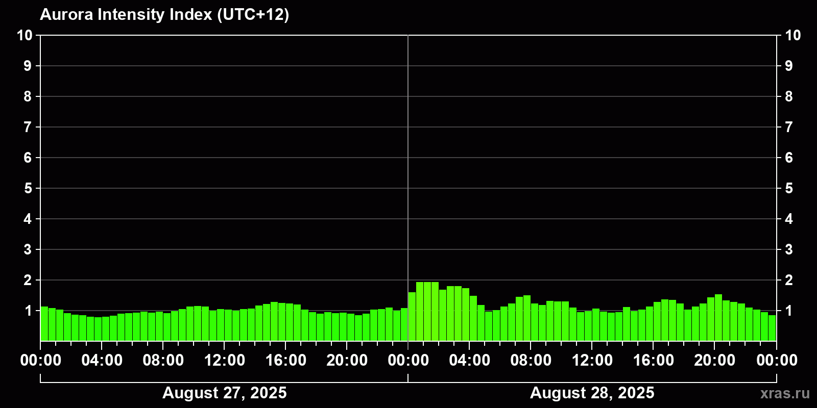 Changes in the auroral intensity index from 2025-08-28 to 2025-08-29 local time