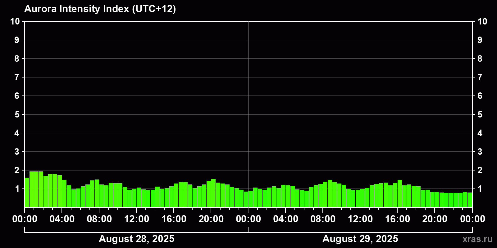 Changes in the auroral intensity index from 2025-08-28 to 2025-08-29 local time