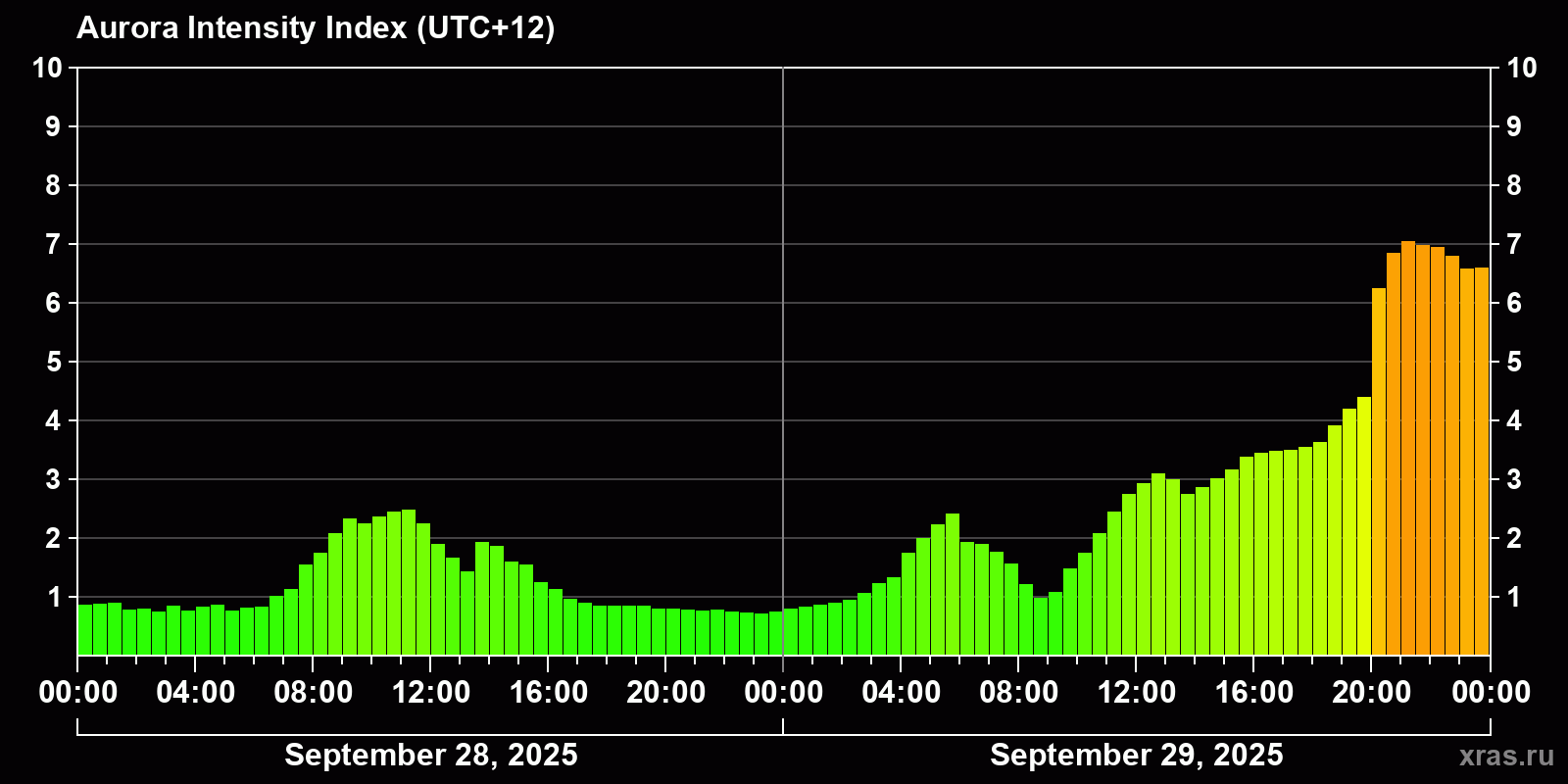 Changes in the auroral intensity index from 2025-09-28 to 2025-09-29 local time