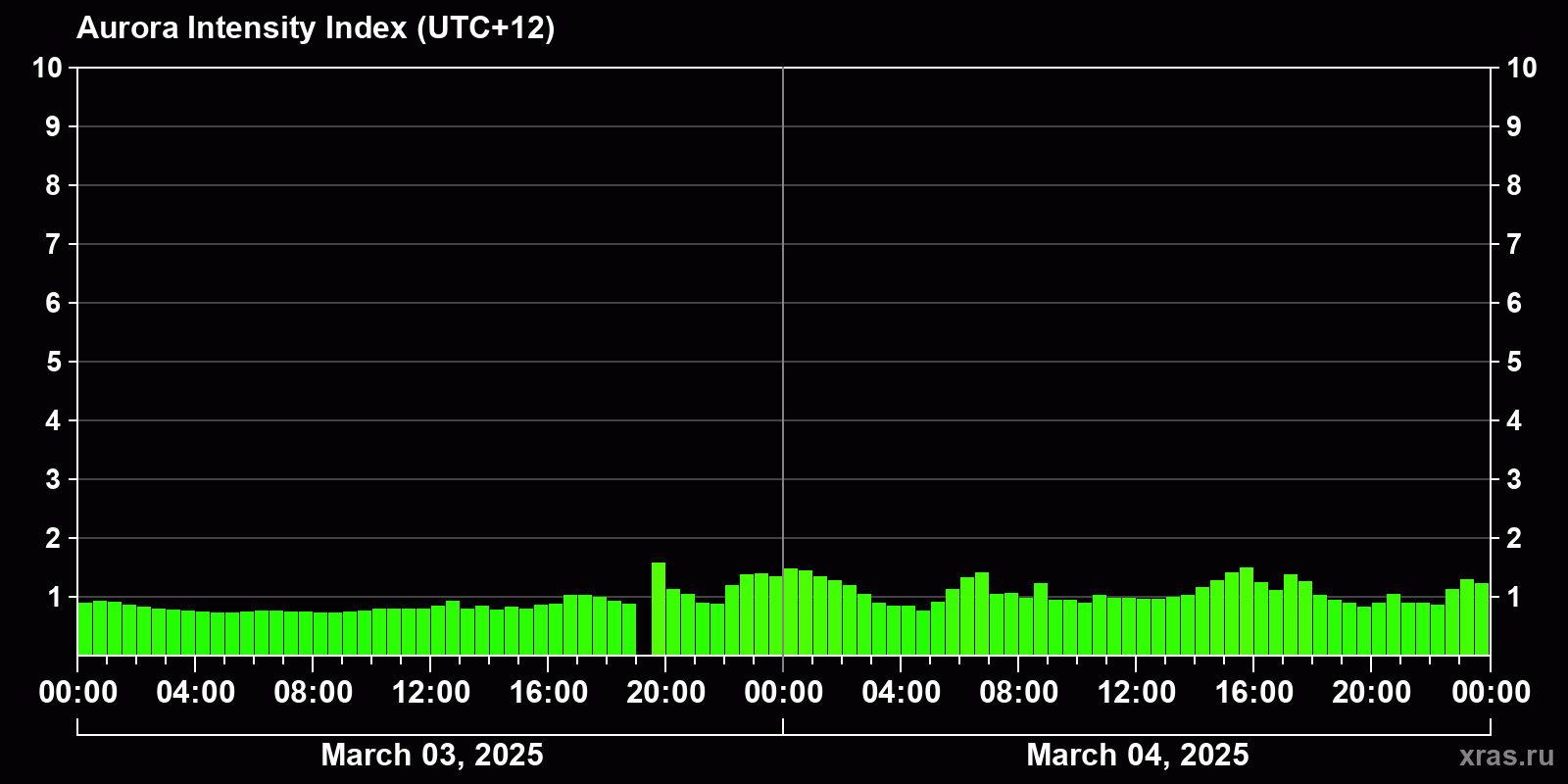 Changes in the auroral intensity index from 2025-03-03 to 2025-03-04 local time