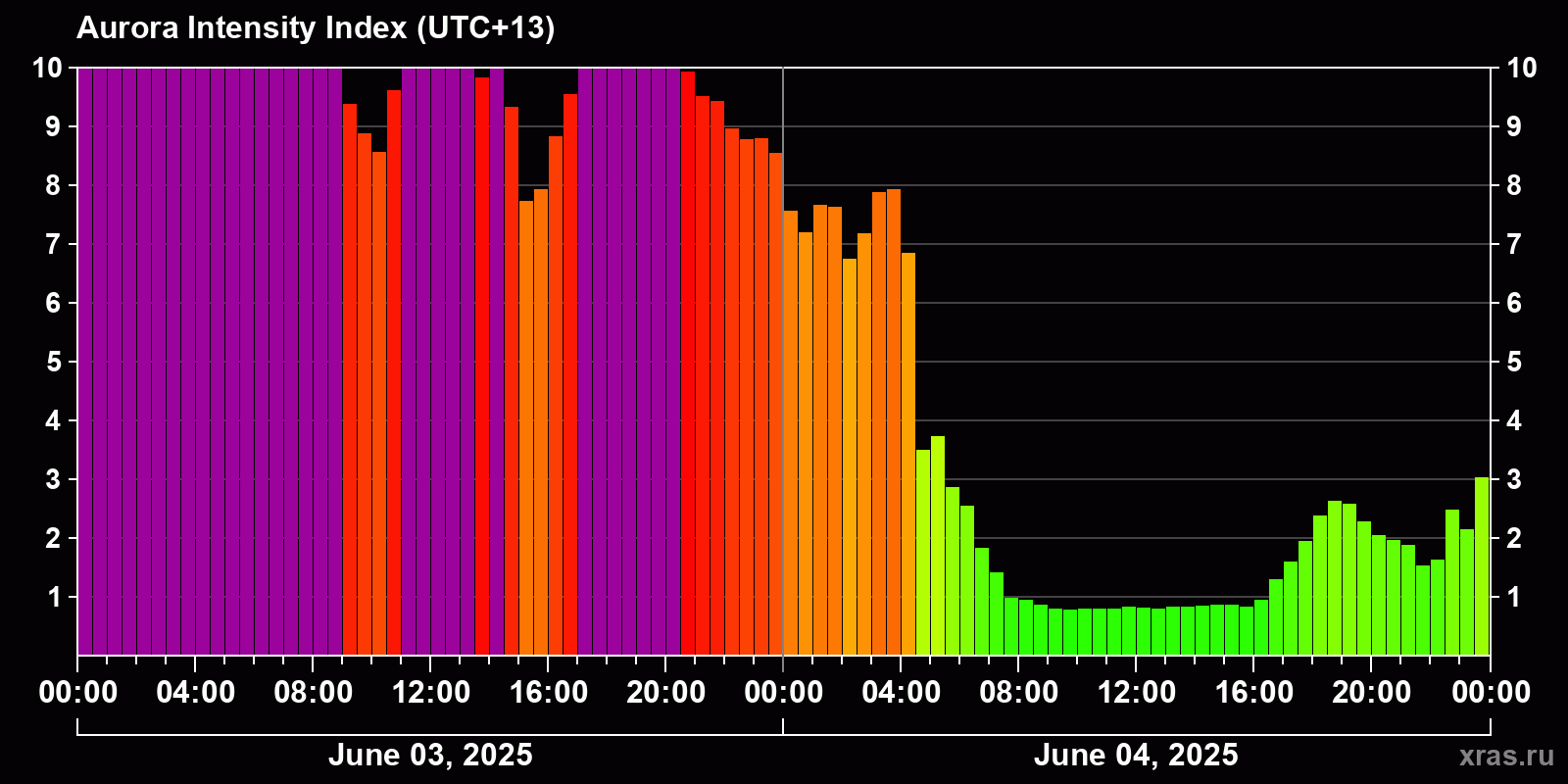 Changes in the auroral intensity index from 2025-06-04 to 2025-06-05 local time
