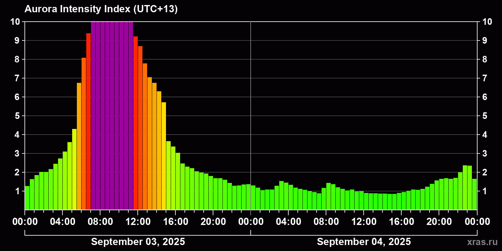 Changes in the auroral intensity index from 2025-09-04 to 2025-09-05 local time
