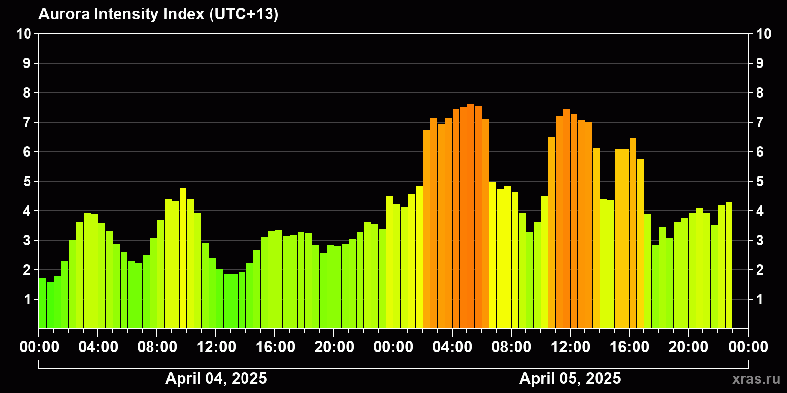 Changes in the auroral intensity index from 2025-04-04 to 2025-04-05 local time